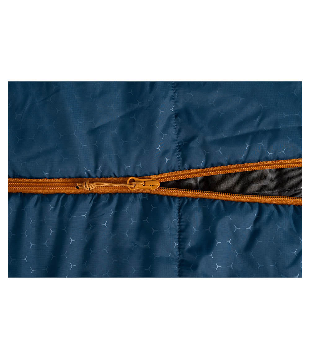 The sleeping bag is made from 100% recycled polyester. Using mono-material ensures that the product can be better recycled in the end. The synthetic material also insulates very well even in damp conditions. The 3D foot box keeps your feet warm and has an extra compartment inside. Foot warming pads or clothing can be easily stowed in it. The comfortable hood has a drawstring so that less heat can escape.