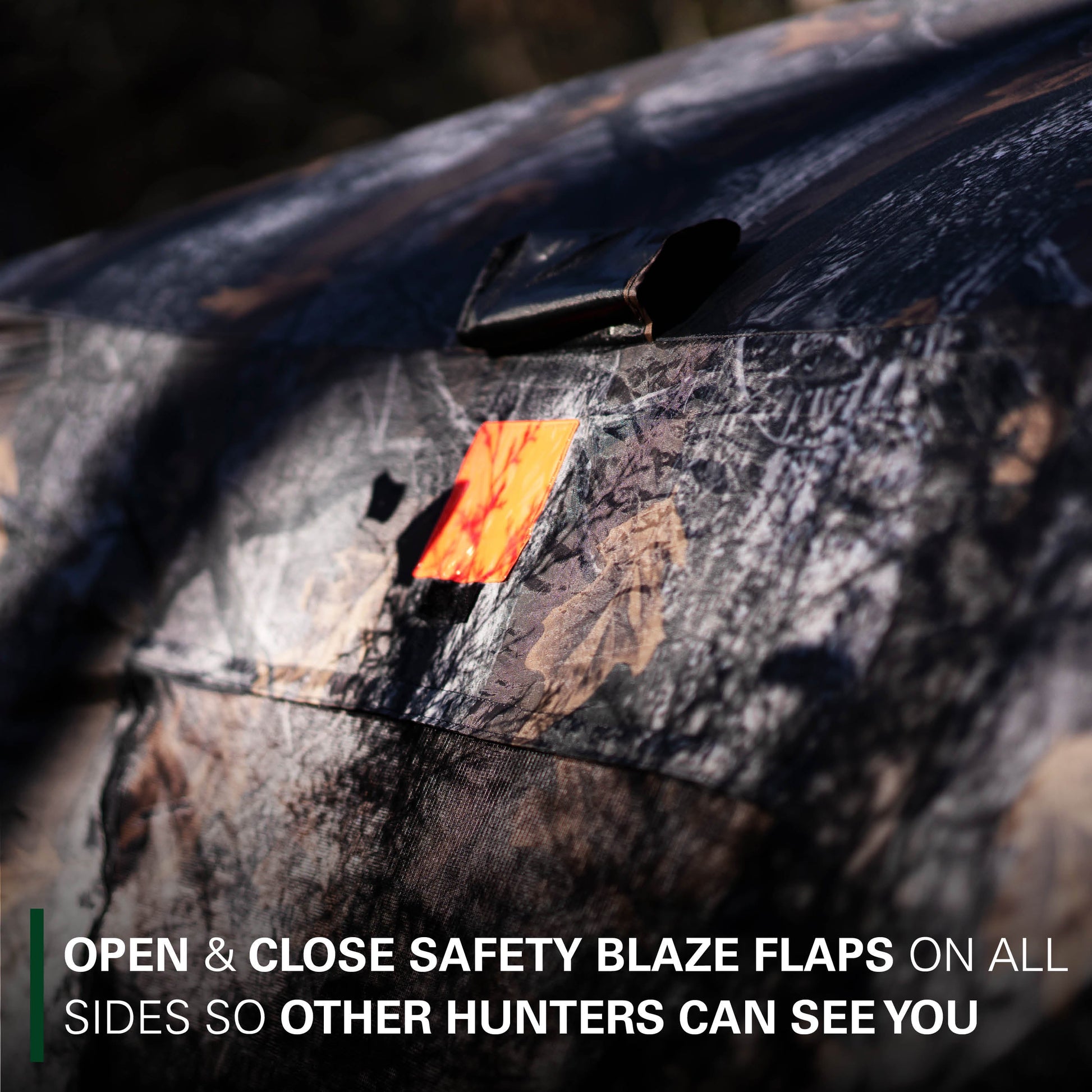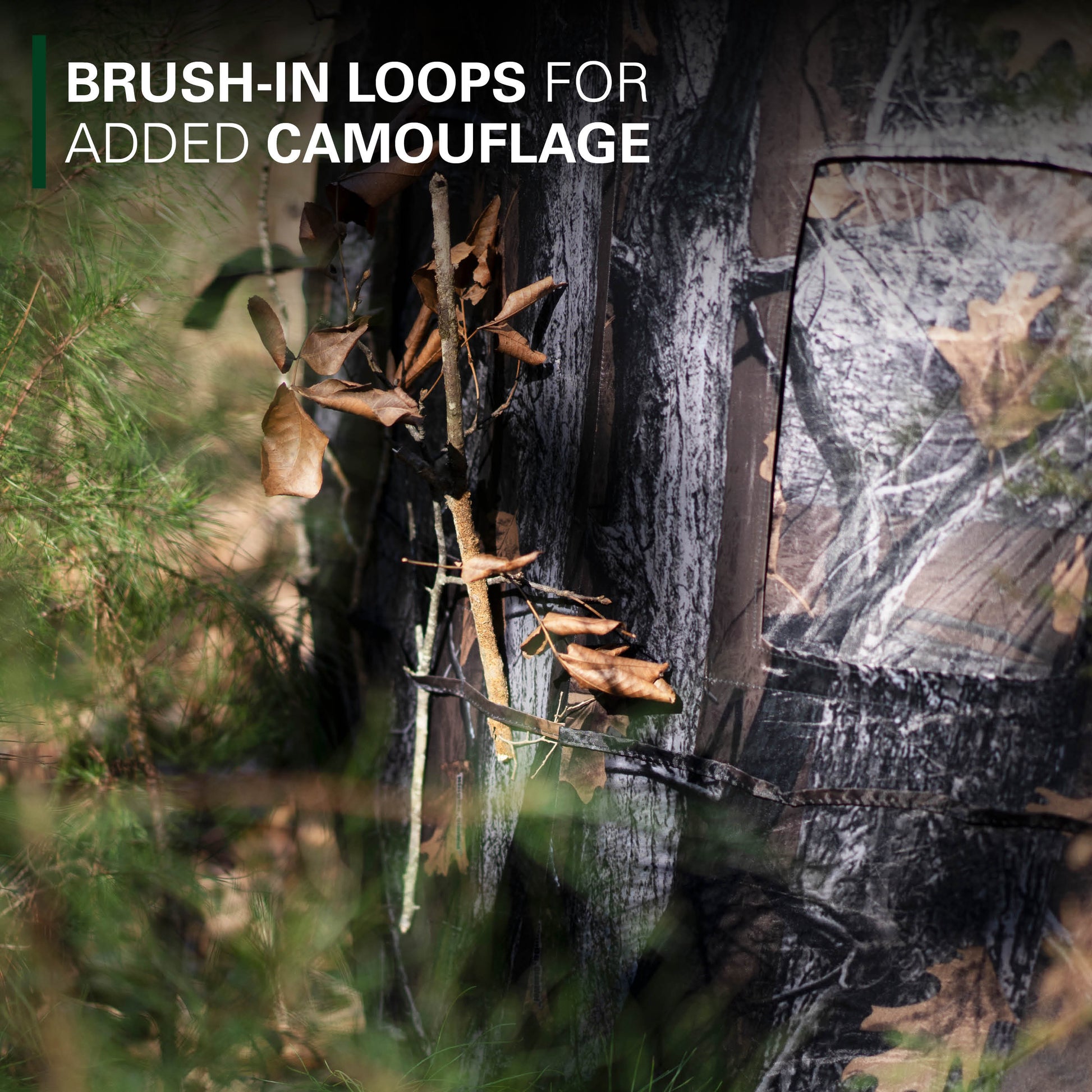 - ENHANCED CAMOUFLAGE: Tree and leaf pattern camo with added loops to brush-in the deer blind with grass and leaves and maximize the hunting ground blind’s camouflage and remain undetected even when you need to move inside the blind. Plus, it’s big enough to comfortably fit you and another hunter.