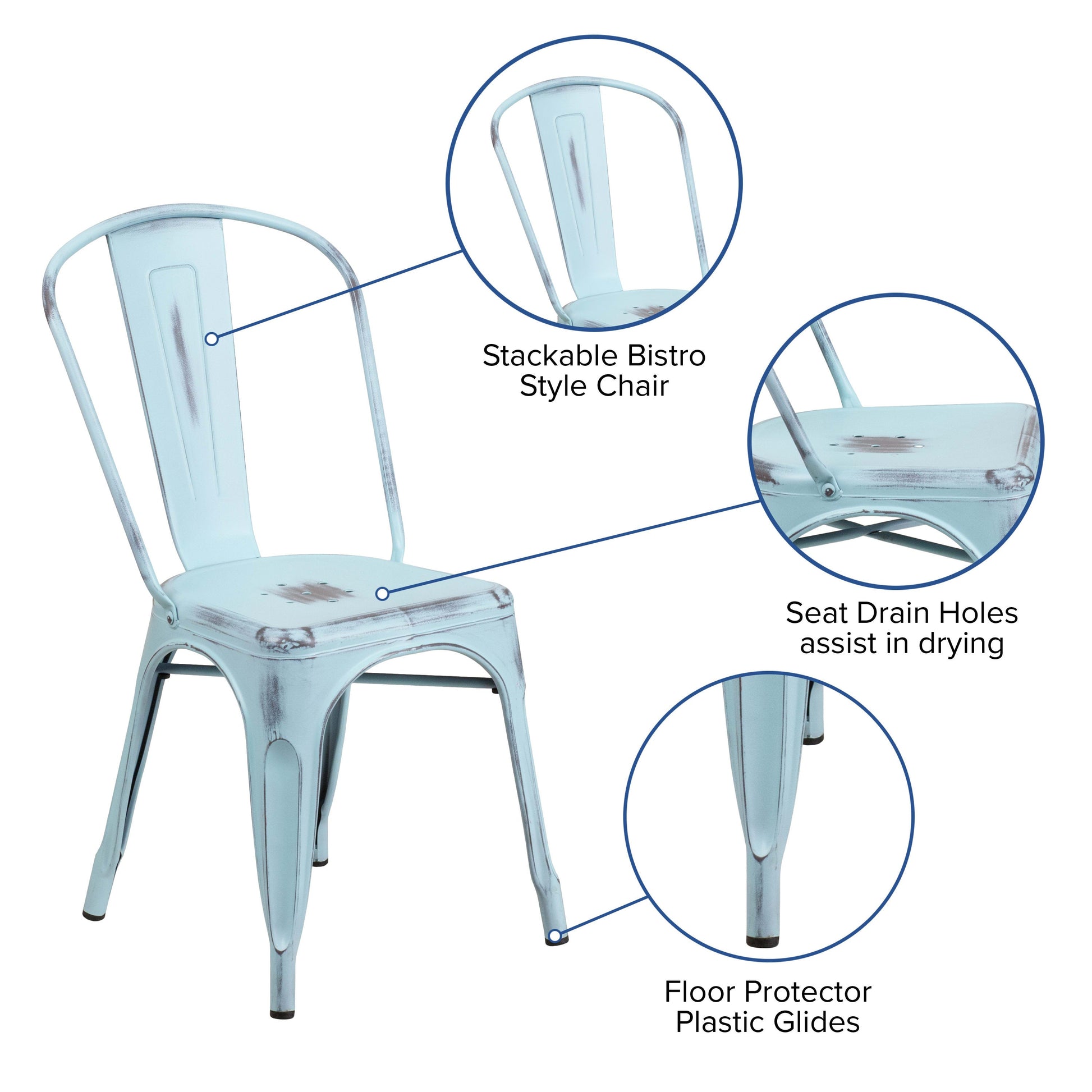 Bistro chairs add a trendy old-world look to your restaurant and will add some color to your employee breakroom furniture. These cool colorful chairs can be enjoyed by everyone, high school and college students love to see trendy furniture used in their schools. The distressed metal chair features a curved back with a vertical slat along with a stabilizing cross brace. Your colorful dining chair will last longer thanks to the plastic bumper guards that protect the chairs' finish when stacked. While being used outside on the deck, pool or patio, you'll be delighted to find that these outdoor stacking chairs include drain holes to prevent pooling in the center of the seat. This translates to quicker seating turnaround times in your busy establishment.