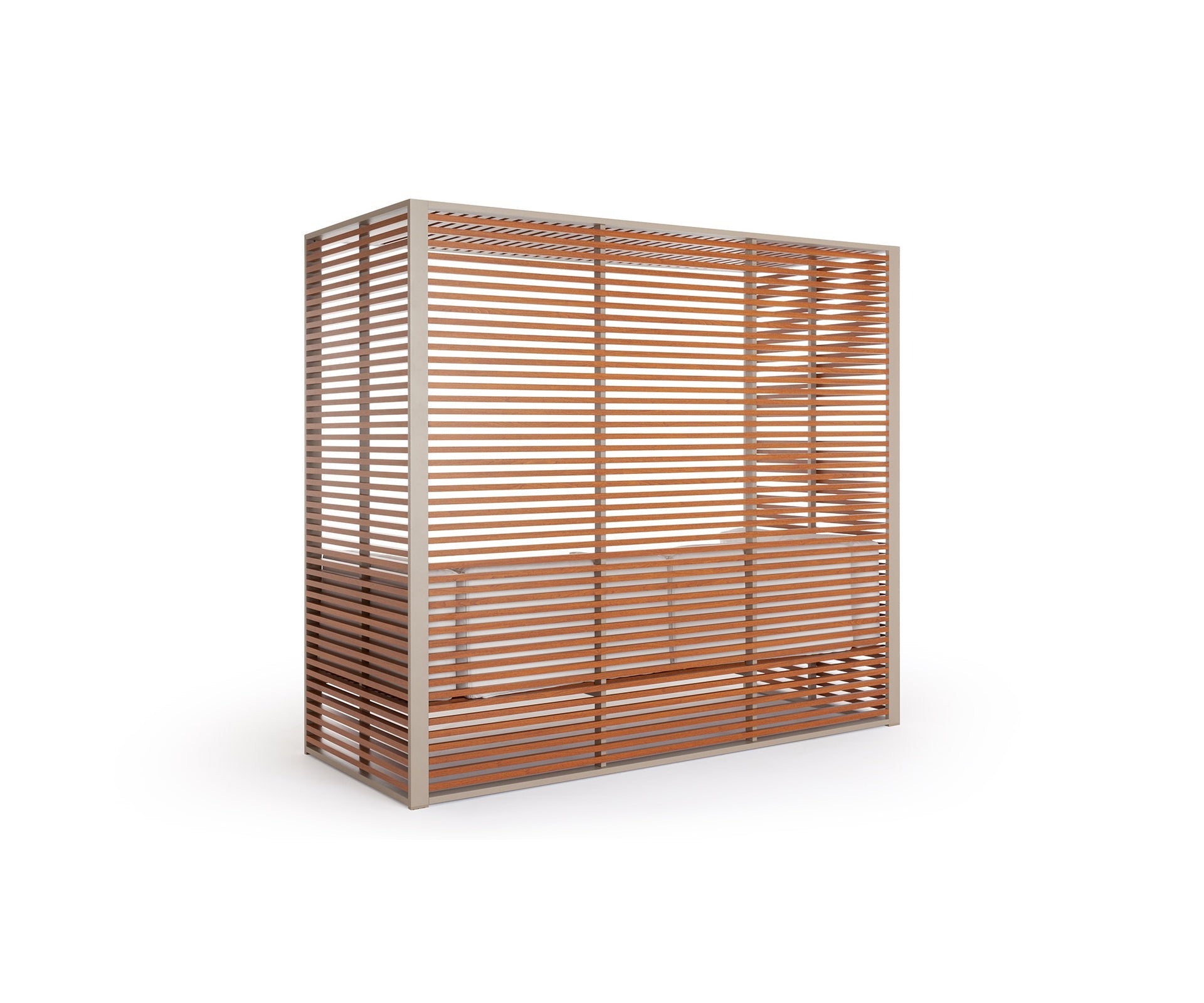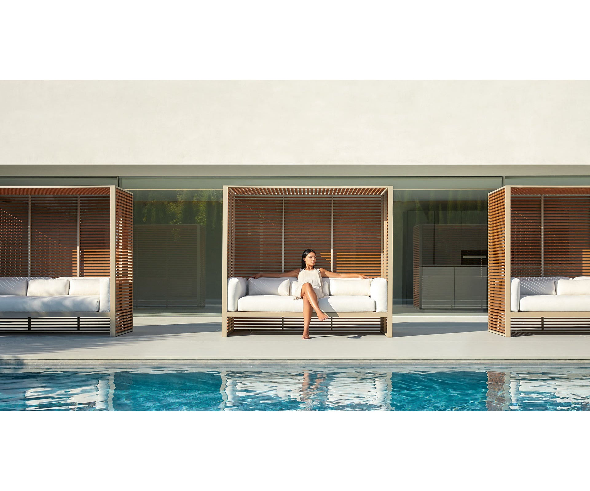 The DNA Al Fresco sofa is an elegant designer piece of furniture developed by José A. Gandía-Blasco Canales from an innovative and exclusive aluminium slat construction system, available in a powder-coated paint finish and now also in a wood-effect finish. On this structure rest cushions and pillows made of polyurethane foam rubber covered with water-repellent fabric and removable upholstery, available in the different colours of the collection.