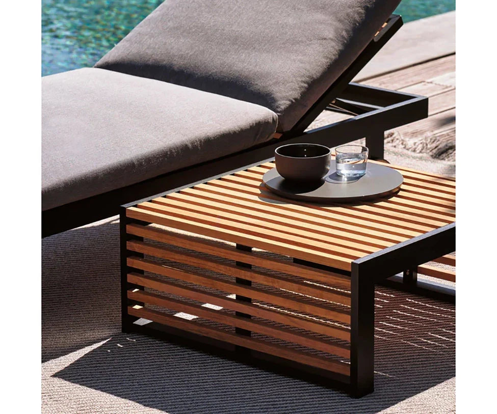 The DNA Teak side table is inspired by these traditional horizontal geometries of Japanese architecture, also characteristic of Mediterranean shutters. It is the designer table that complements the DNA TEAK chaise lounge.