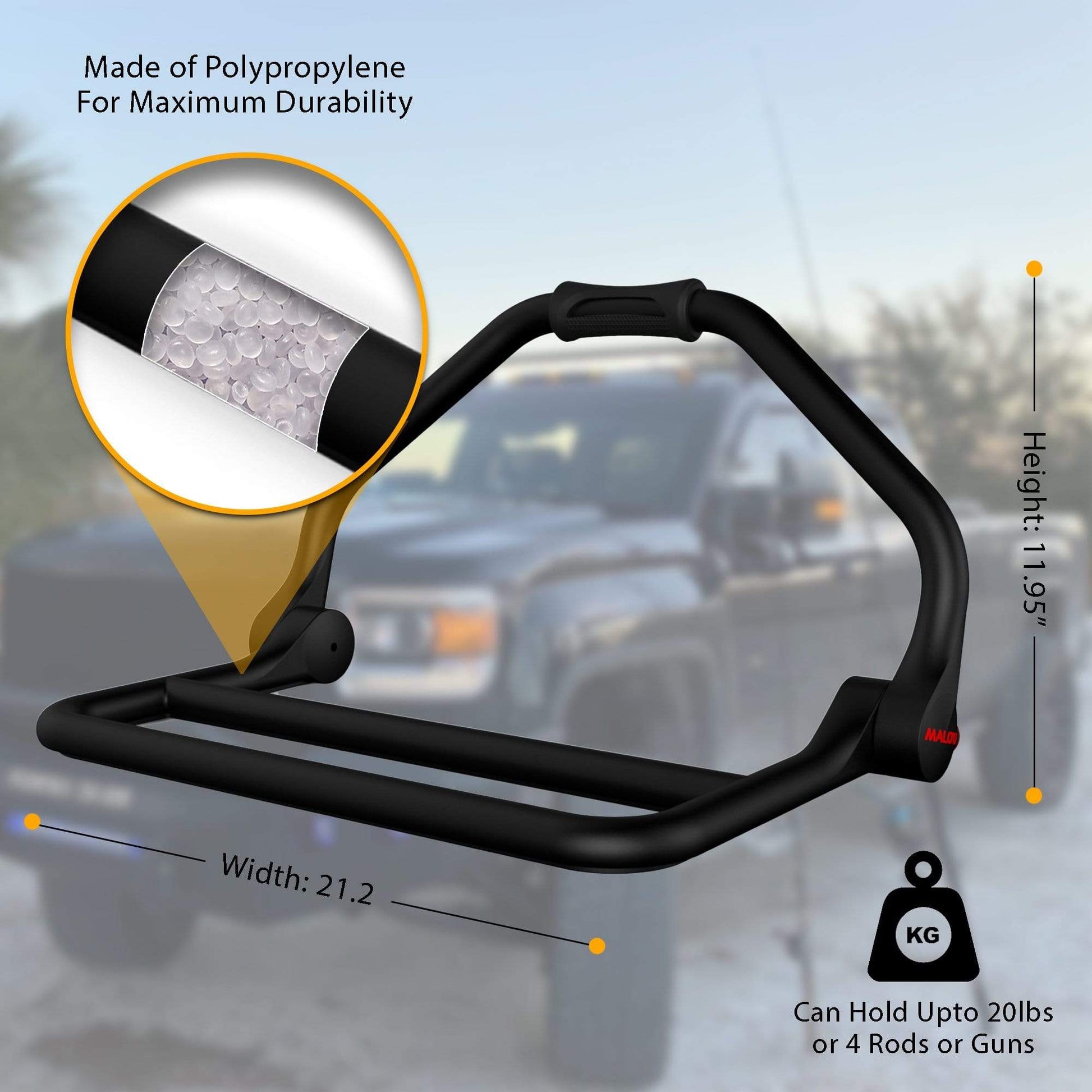 The Malo'o DryRack Fishing Rod Holder & Gun Rack is a versatile and convenient accessory for hunting and fishing. It's easy to use - just attach it to the side view mirror of your vehicle and use our new patented rack clips to secure your fishing poles or hunting guns.