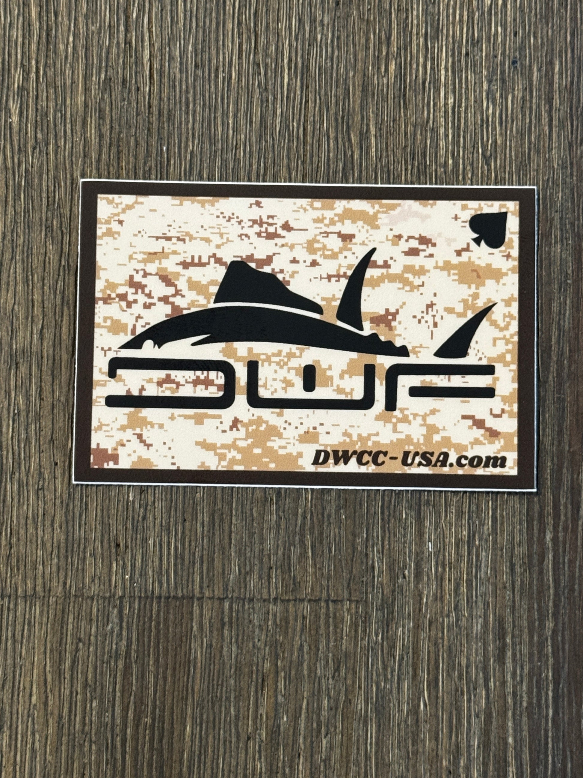 Enhance your outdoor gear with our DWF Camo 3" sticker. Made with durable, high-quality camouflauge material, this sticker is perfect for adding a touch of style to your equipment. Show off your love for the great outdoors with this unique and versatile sticker.