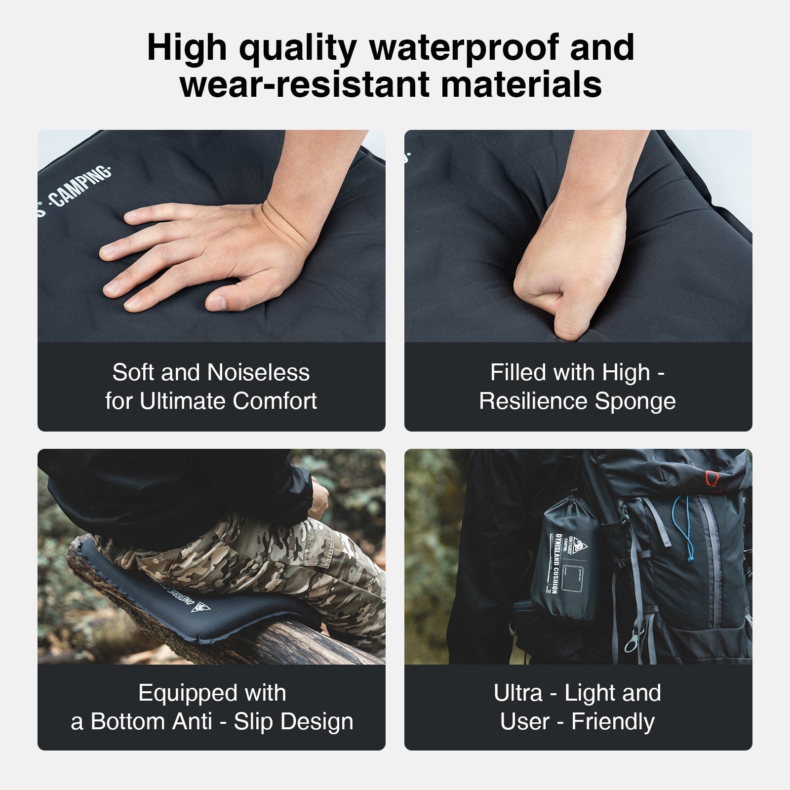 【Soft Yet Durable:】Dynisland Inflatable Seat Cushion using 30D polyester TPU waterproof fabric, it is environmentally friendly, skin-friendly, tear resistant, no noise, and waterproof performance is good. The bottom fabric is made of non-slip particles, which can be stable in any terrain environment, ensuring always excellent performance.