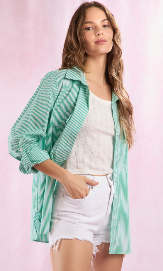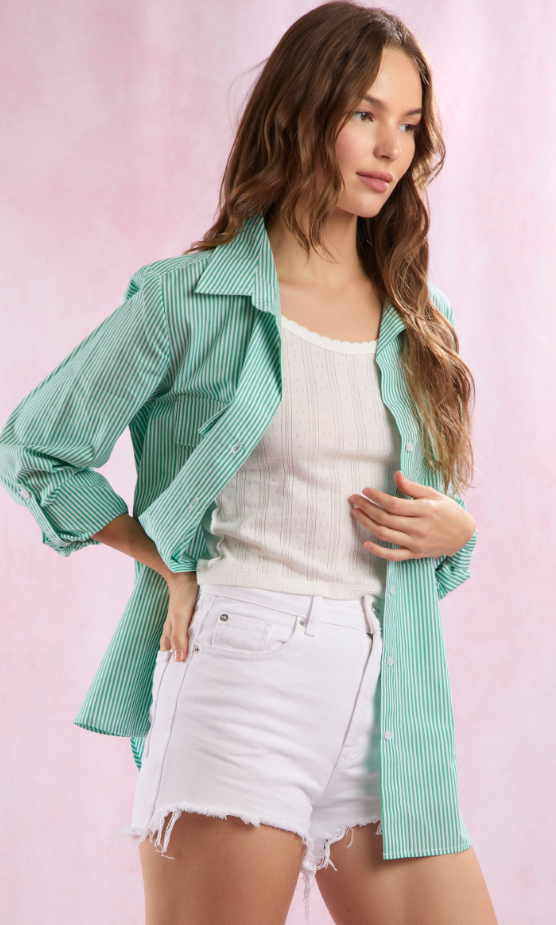 Add a pop of color to your wardrobe with our Elle Striped Button Up in kelly green. This long sleeve shirt is perfect for any occasion and adds a touch of sophistication to any outfit. Stay stylish and comfortable in this must-have piece!