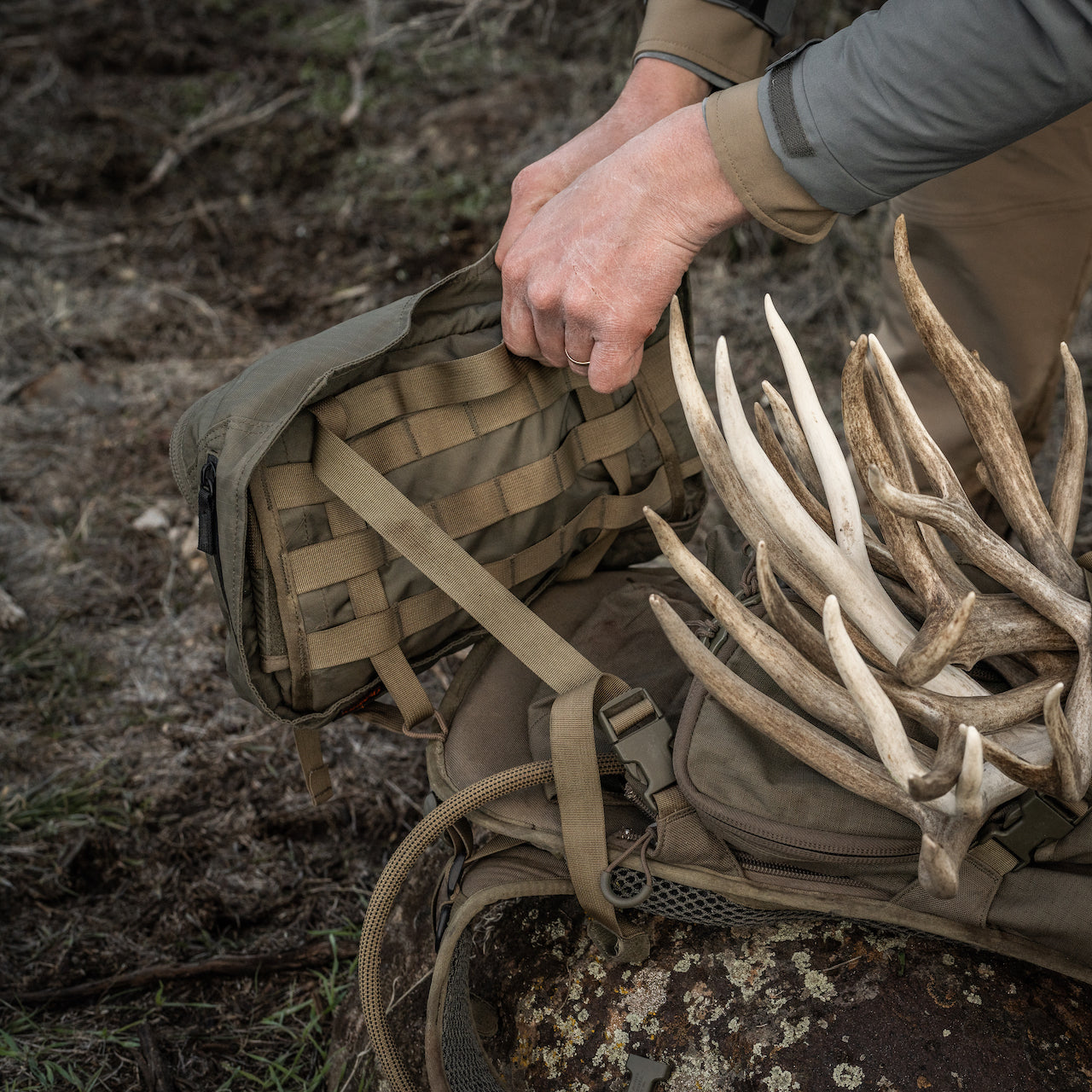 The MultiLid™ uses MOLLE webbing to attach anywhere with compatible webbing, but is most often used and recommended at the top of the pack to function as a quick-access lid for essential items. The MultiLid features a large main open pocket as well as a dedicated water bladder sleeve that fits a standard 3L water bladder. On the underside of the MultiLid is a sleeve where the waist belt is stowed when the lid is pack-mounted. The MultiLid allows the user to downgrade from a pack to a shoulder or waist worn essentials-only go bag.