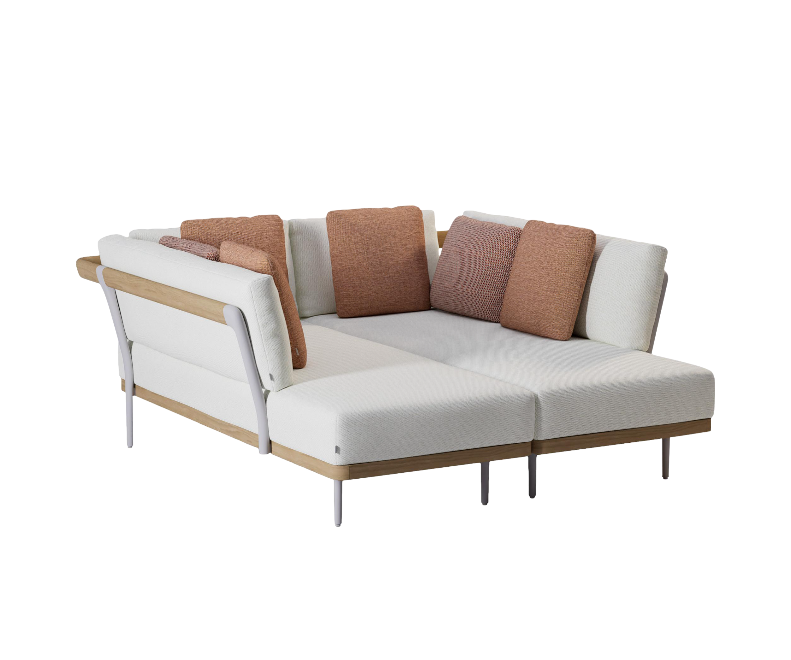 Flows unites a world of contrasts: limber yet strong, this collection features a light, elegant aluminium frame combined with the warmth of a handcrafted wood finish. Flows carefully balances old and new to give the pieces their defining characteristics. The unique shape of the oval legs turns the Flows sofas and loungers into one-of-a-kind pieces destined for long-lasting appreciation.