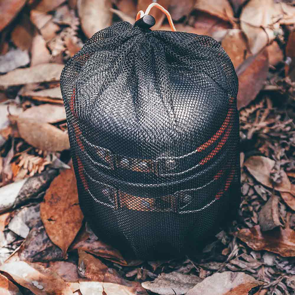 The 195g FMC-207 Solo Cookware offers a lightweight solution for solo chefs, accommodating a gas canister and stove while providing durable, fire-resistant hard-anodized aluminum for easy cleanup.