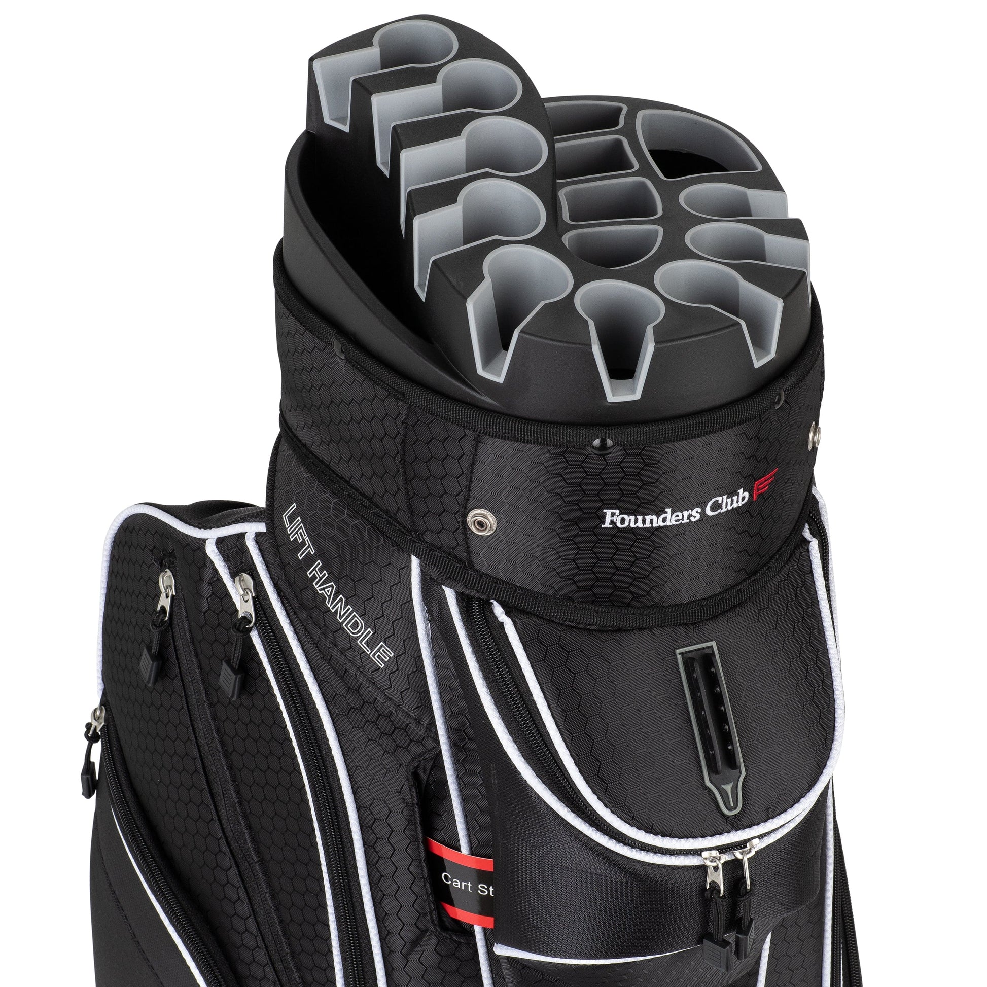 - Founders Club Golf Set Comes with 14 Way Organizer Bag - Club Management Design Top- Molded 14 Way Top Organizer protects irons from damage as well as keeping clubs from rattling/clanging and making noise. Each iron, wood, and putter has it’s own dedicated spot so you will always find the club you need quickly and notice when a club is missing. The putter spot accepts larger grips up to 1 ¾” in diameter - Equipped with 9 zippered pockets and 2 mesh pockets for ample storage for all your gear
