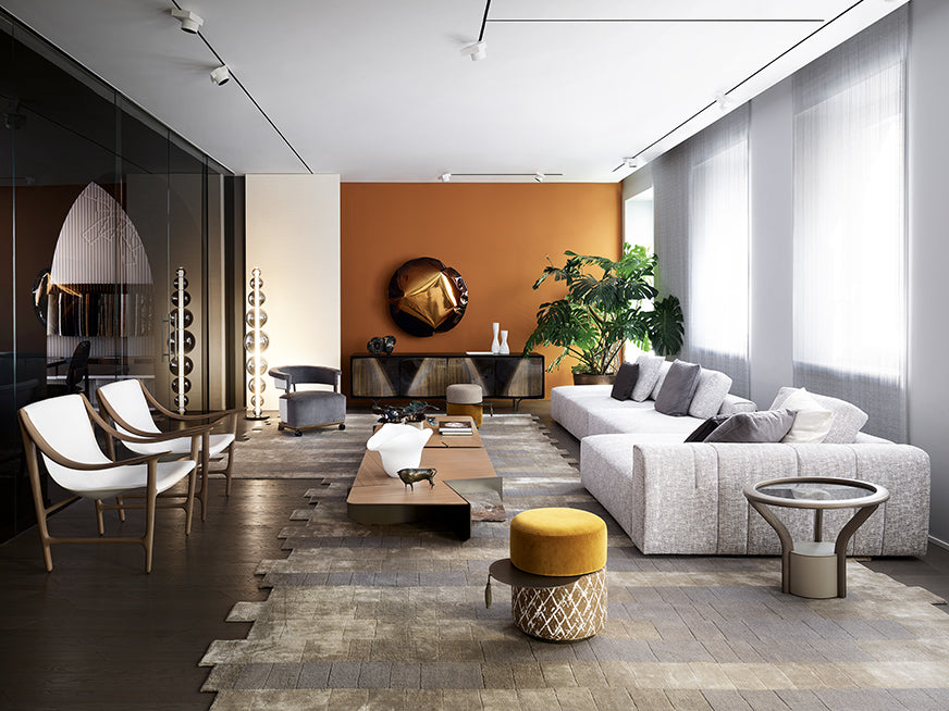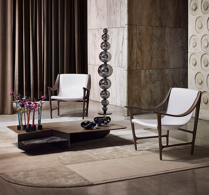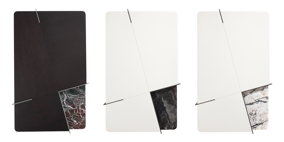 Upper Top: Available in Canaletto walnut (natural, grey, or dark) with rotated inlays, or Leather/Pelle Plus with stitching aligned to the structure's diagonals.
