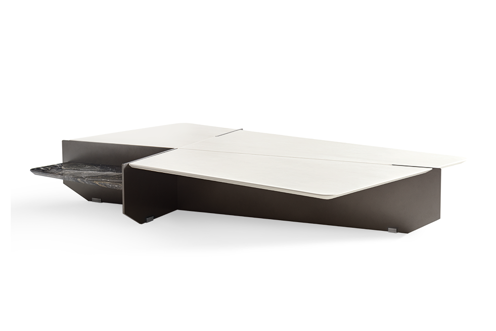 The GHIBLIM low coffee table showcases a pewter-painted metal cross base and a two-level top, offering a striking, geometric design. This refined mix of materials and finishes creates a unique three-dimensional effect, making GHIBLIM a sophisticated addition to modern interiors.