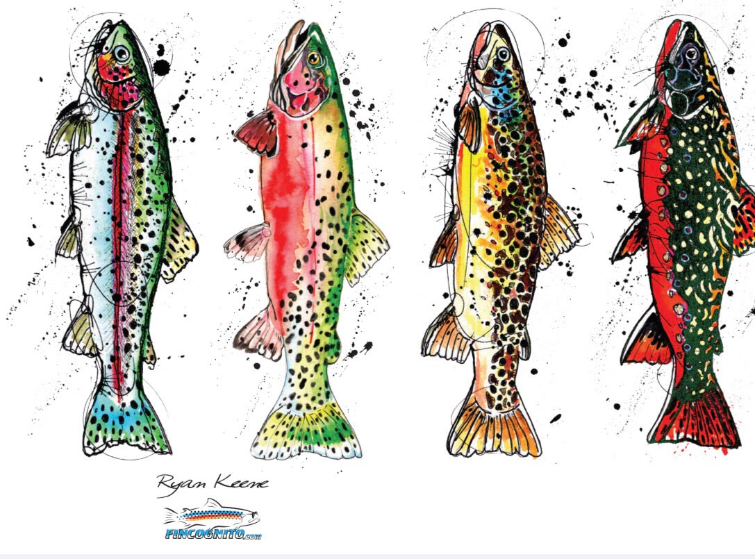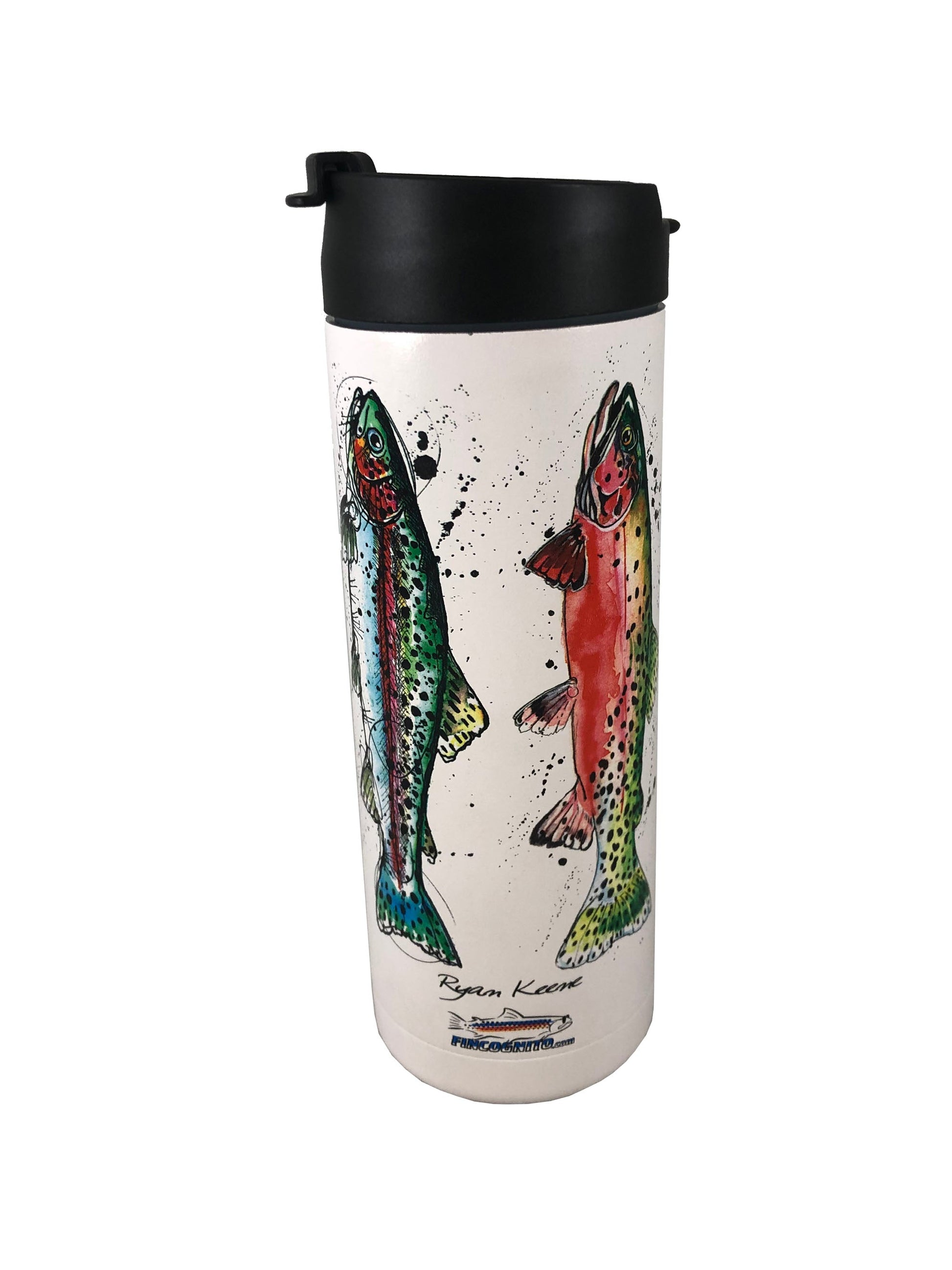 Our 20 oz. double walled bottle will keep your cold beverages icy cold and your hot beverages steaming for hours. Shipped with a screw off water bottle top and a flip top coffee lid, you’re set for the drive to the put-in or all day in the boat. Featuring stunning artwork from Ryan Keene, we present the grand slam of trout fishing...rainbow trout, western cutthroat, brown trout and brook trout. White bottle.