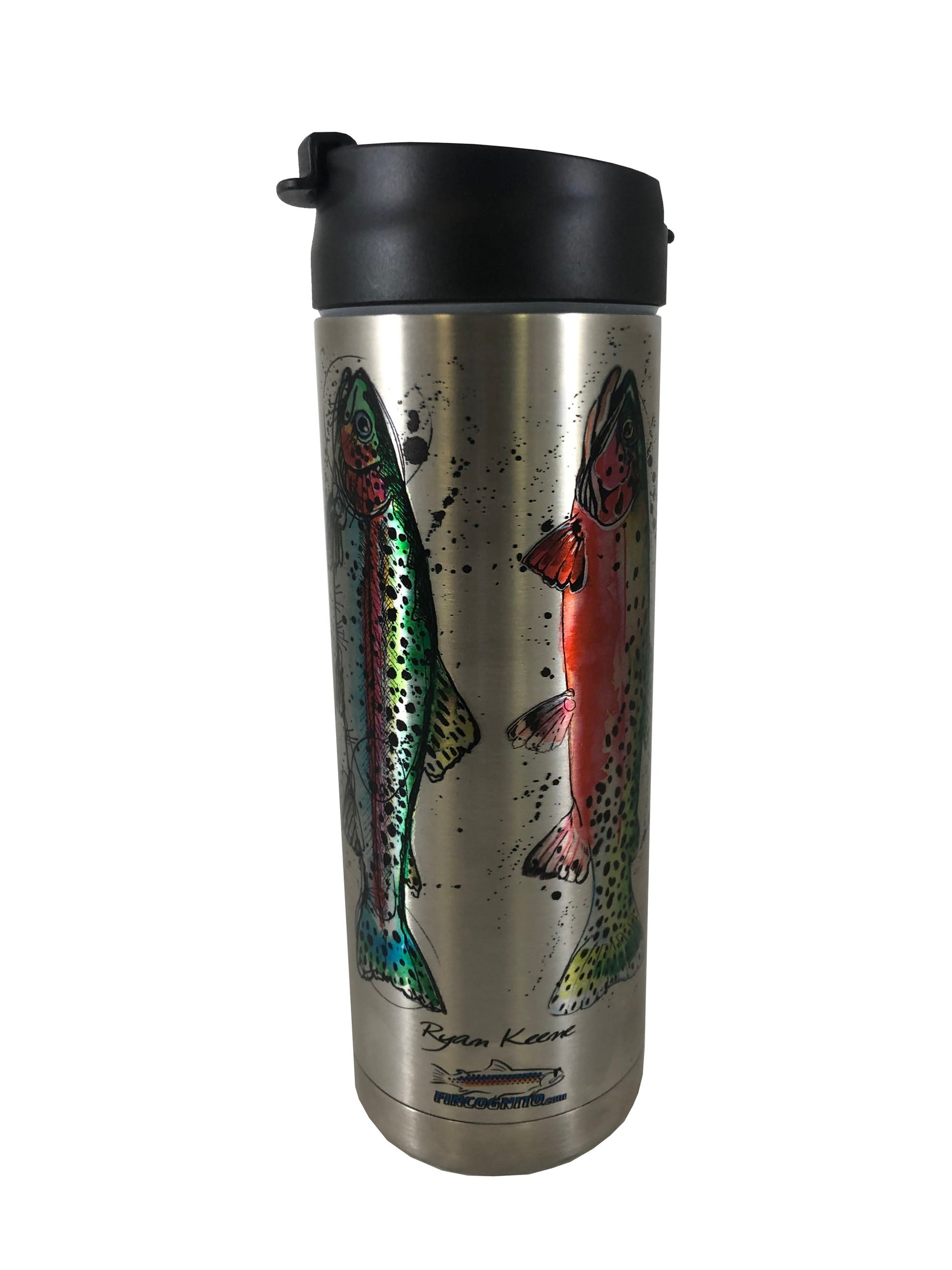 Our 20 oz. double walled bottle will keep your cold beverages icy cold and your hot beverages steaming for hours. Shipped with a screw off water bottle top and a flip top coffee lid, you’re set for the drive to the put-in or all day in the boat. Featuring stunning artwork from Ryan Keene, we present the grand slam of trout fishing...rainbow trout, western cutthroat, brown trout and brook trout. Stainless bottle.