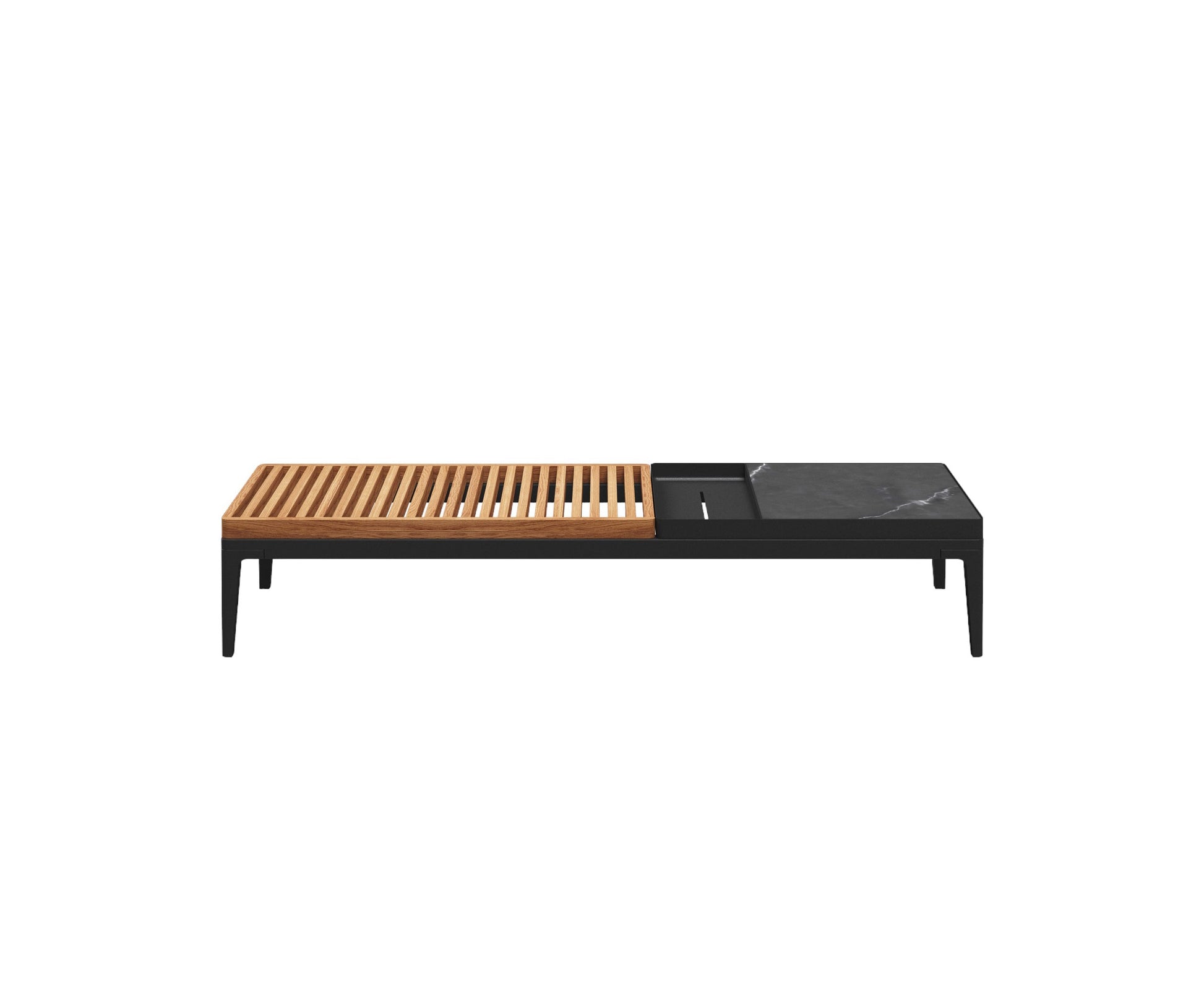 Notes: Powder coated aluminium frame. Natural finish slatted teak & one piece ceramic table top.