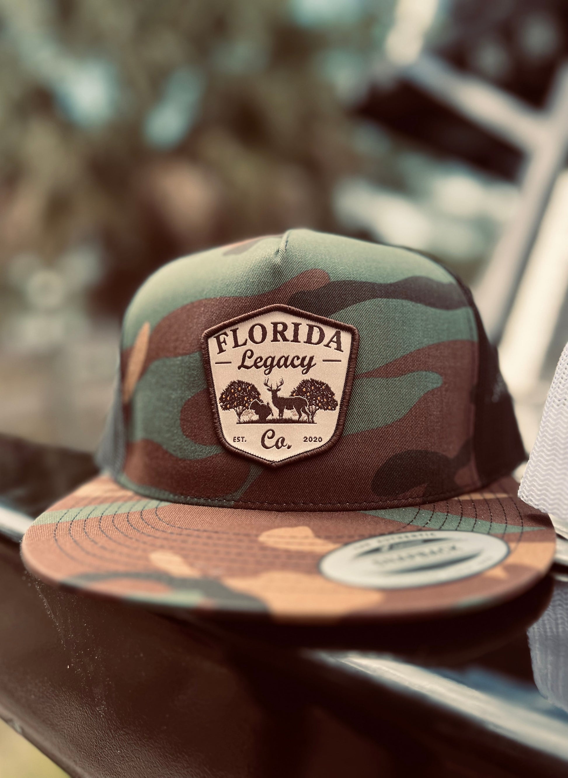Introducing the Florida Legacy Co. Grove Goat, featuring a stylish Camo Yupoong Flat Bill with Patch. This unique cap is perfect for anyone looking to add a touch of personality to their outfit while also protecting from the sun. Made with high-quality materials, it's durable and fashion-forward.