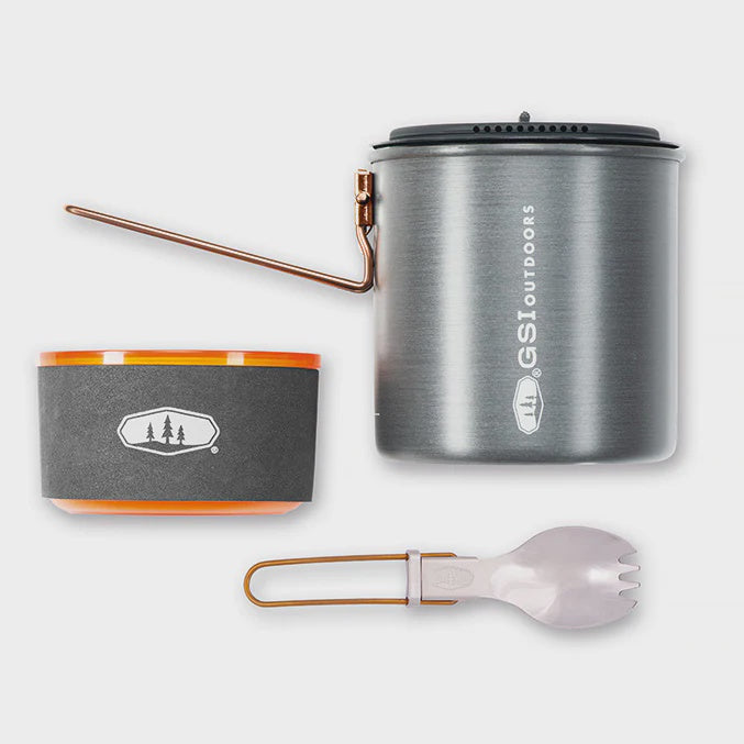Welded stuff sack holds set while traveling and doubles as a sink or wash basin.