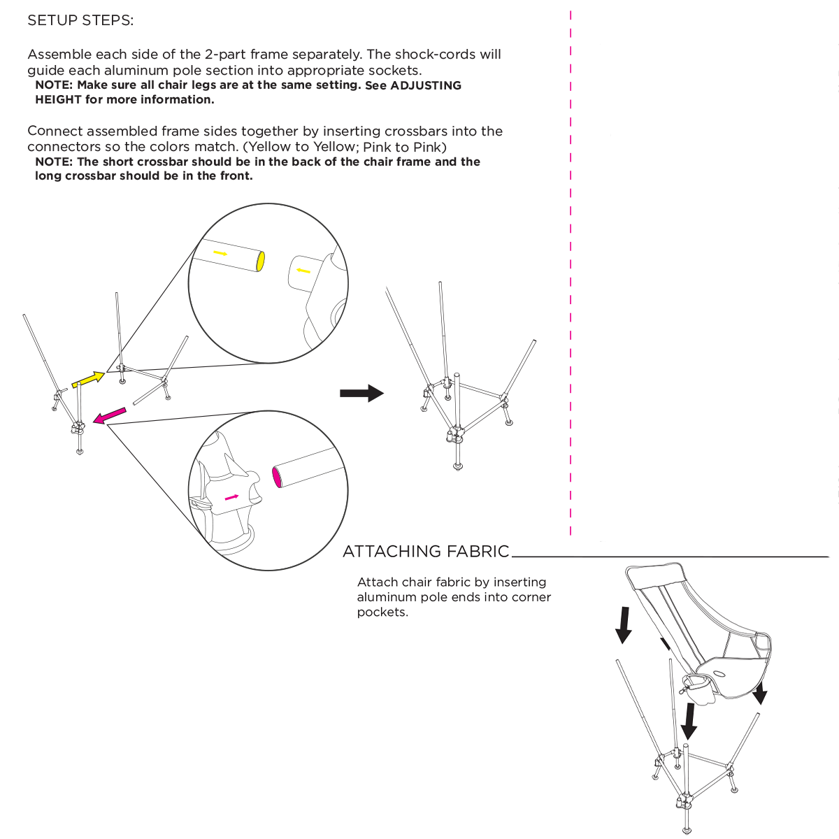 - Note: The short crossbar should be in the back of the chair and the long cross bar in the front.