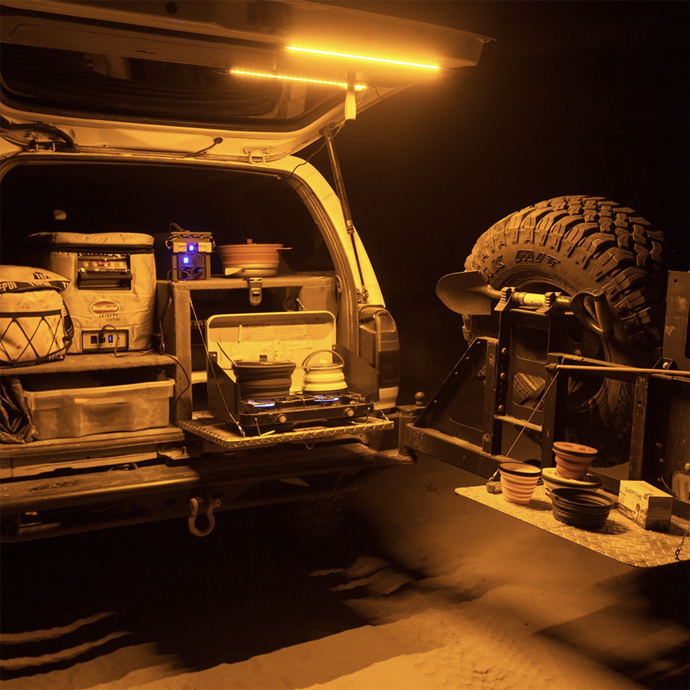 Our new LED camp lights are better than ever. Camp lighting for the most extreme campers! Our 2 bar LED campaign light kit is a perfect started kit for a small set-up or those new to camping in general. This light also works great for illuminating canopies or toolboxes. We offer 1,180 lumens in total light output on white giving you plenty of options when lighting your campsite. We made a revised extrusion profile for extra strength and removable diffuser for a wider and better light beam. High performance and extreme attention to detail.