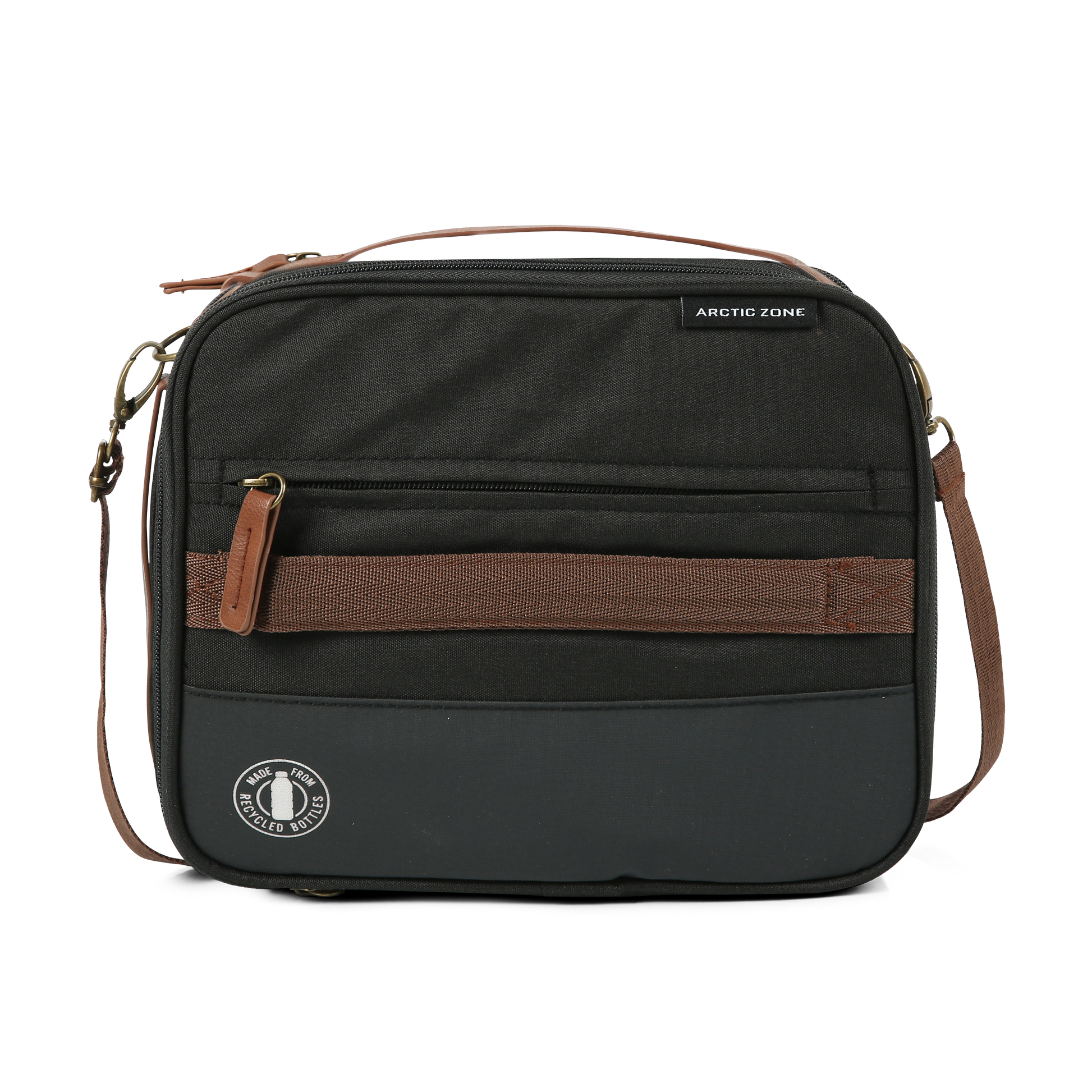 The exterior of the Arctic Zone Eco Expandable Lunch Box is partially made with sustainably sourced materials from recycled plastic bottles* and includes a zippered accessory pocket, vegan leather handle and trim. The lunch pack also comes with a high performance ice pack to enhance cold retention.