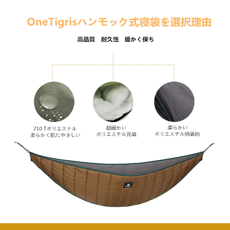 -【防風、防寒】キャンプで寒い日に出くわすことがあって、アンダーキルトをハンモックの下部に取り付けたら、暖かくなれ、朝まで安心に眠れます。(ご注意:非常に寒い日にキャンプをするの場合、本体だけではなく、他の防寒用装備も必要になります。)