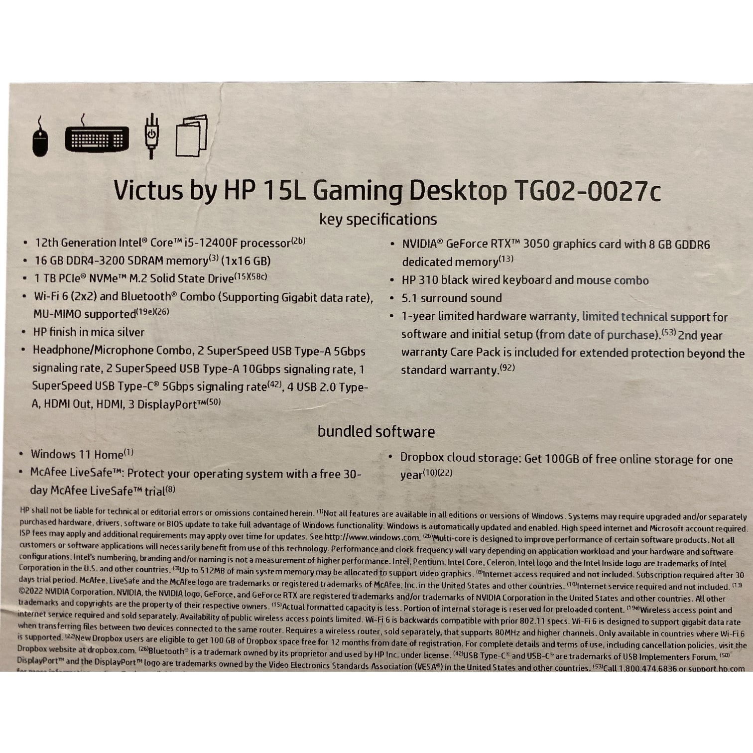 Brand: HP Series: Victus Model #: TG02-0027c Chassis Build: Mica silver Screen: N/A Touch: N/A Convertible (2-in-1): N/A Backlit Keyboard: No Optical Drive: No Processor: 12th Generation Intel® Core™ i5-12400F processor Memory (RAM): 16 GB DDR4-3200 SDRAM memory Storage: 1 TB PCIe® NVMe™ M.2 Solid State Drive Graphics: NVIDIA® GeForce RTXTM 3050 graphics Operating System: Windows 11 Home Dimensions: 6.10 in (W) x 13.27 in (H) x 11.71 in (D) approx. Weight: 13.91 lb approx. 12th Gen Intel® Core™ processor 12th Gen Intel® Core processor distributes performance where you need it the most—saving you time and increasing your ability to multitask and switch seamlessly between applications. Designed with the planet in mind Built with the environment in mind, this Victus 15L Gaming Desktop is designed using sustainable materials like water-based paint. MU-MIMO supported Pair with a MU-MIMO router for a smoother online experience in multi-device homes. 5.1 Surround Sound output All the necessary ports for truly immersive sound quality with 5.1 surround sound. SuperSpeed USB Type-C® 5Gbps signaling data rate Plug in your external storage with this Superspeed USB Type-C® port, featuring 5Gbps signaling data rate. And it’s reversible, so you never have to worry about plugging in upside down.