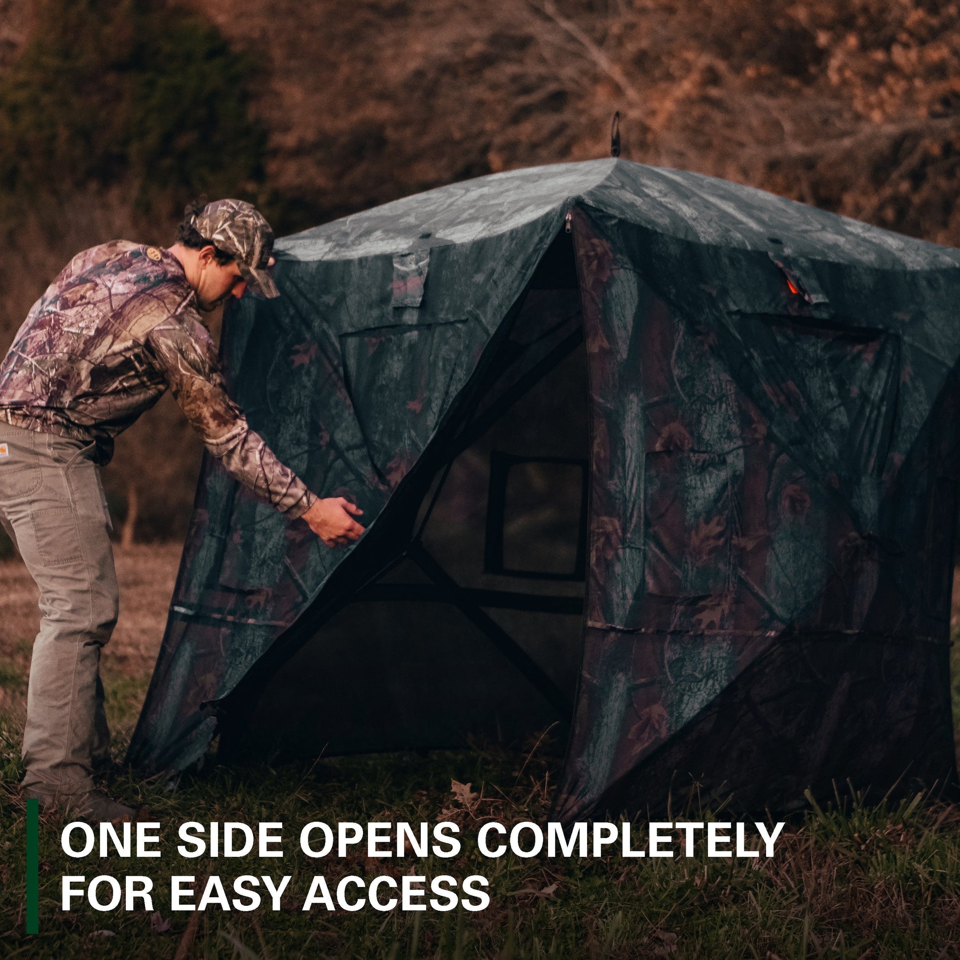 - ENHANCED CAMOUFLAGE: Tree and leaf pattern camo with added loops to brush-in the deer blind with grass and leaves and maximize the hunting ground blind’s camouflage and remain undetected even when you need to move inside the blind. Plus, it’s big enough to comfortably fit you and another hunter or two.