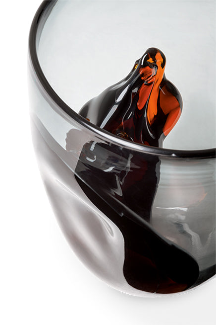 The INCANTO vase is a masterpiece of blown glass, featuring the elegant line of flowing curves that will remind one of the warm embracing fire. Crafted using the traditional incalmo glass technique, it showcases seamless transitions between colors with exquisite hand decoration. Available in a single size and a striking fumé/rust colorway, the INCANTO vase is a perfect blend of artistry and sophistication.