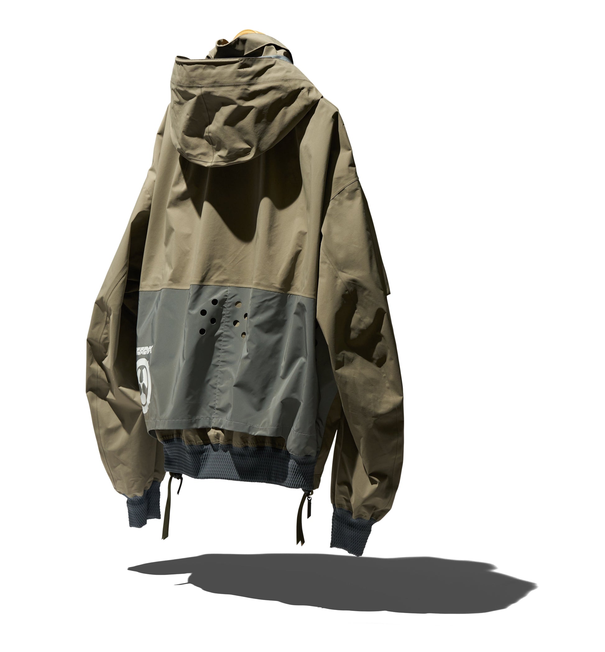 J110’s oversize shape and variable stage center front closure accommodates myriad body types and layers. Detached entry shoulder pockets and bilateral front pockets provide ample storage. The side elevation of the jacket reveals double rows of Tec Sys webbing for customisation. The back of the jacket features a perforated retroreflective skirt with a high-gloss logo application. Sleeve cuffs and rear hem are in Gore-Tex dimensional flex laminate. The jacket itself is fully taped 3-layer Gore-Tex Pro and Guaranteed to Keep You Dry™.