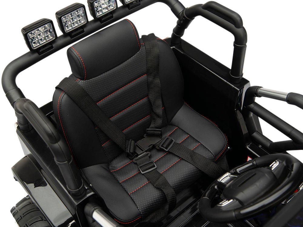 Acquire now and receive the dual power (1 immense 12 volt motor for each rear wheel), 4 wheel genuine rubber tire upgrade, and real leather seat for no additional charge! Scientific research shows that imaginative play leads to successful child development. What better means for your child to envision exciting adventures than by operating their very own Big Wheel style Jeep Truck! Magic Cars* Battery Powered Big Wheel Jeep style ride offers your child endless fun for years to come! With ample strength to conquer any terrain, the Magic Cars* Jeep Truck drives on pavement, dirt, grass, and gravel - even in light snow!