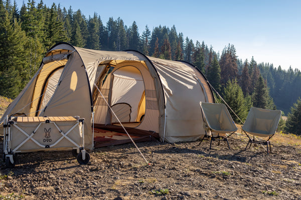 Get away as a couple or small family with the Kama Couple package. The Kamaboko small, with a 132 sq ft footprint, converts from a gigantic sun shelter during the day, to a lounging area in the evening, to a sleeping area at night. Sleeping space for 2 adults comfortably, maximum 3. A large Soto pad fits in the inner tent to give you a great night's sleep, almost as comfortable as your bed at home. Sugoi chairs provide seating for 2, plus the Kama Zashiki removable floor provides a massive waterproof area for lounging. A wagon gets all your gear from the car to the campsite, then doubles as a table.