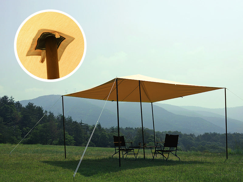 The Kama Tarp creates a massive covered area to your campsite or backyard. The tarp is made to pair with the Kamaboko Tent but works equally well as a stand alone tarp. The Kama is made of durable Canvo™ fabric which which is stronger than polyester and casts deep, cool shadows, great for summer camping. Canvo, unlike polyester, won't melt if it catches a campfire spark. The square shape with many attachment points allow for versatile setups. (For a limited time, comes with pegs, set of two standard poles, and one extra tall pole to lift the center of the tarp).