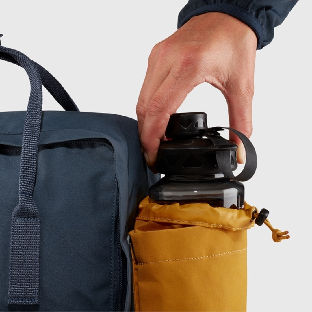Extend the possibilities of your Kånken backpack with this practical bottle pocket. Made from classic Vinylon fabric with a steel frame that slides into your Kånken’s side pocket. It also has a cinched closure with elastic cord at the top to keep contents in place. A great accessory when you need a little extra space in your favourite backpack that also lets you personalise your Kånken by combining your favourite colours.