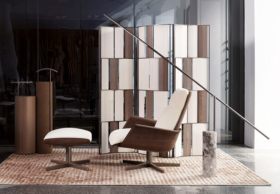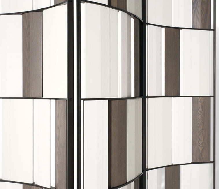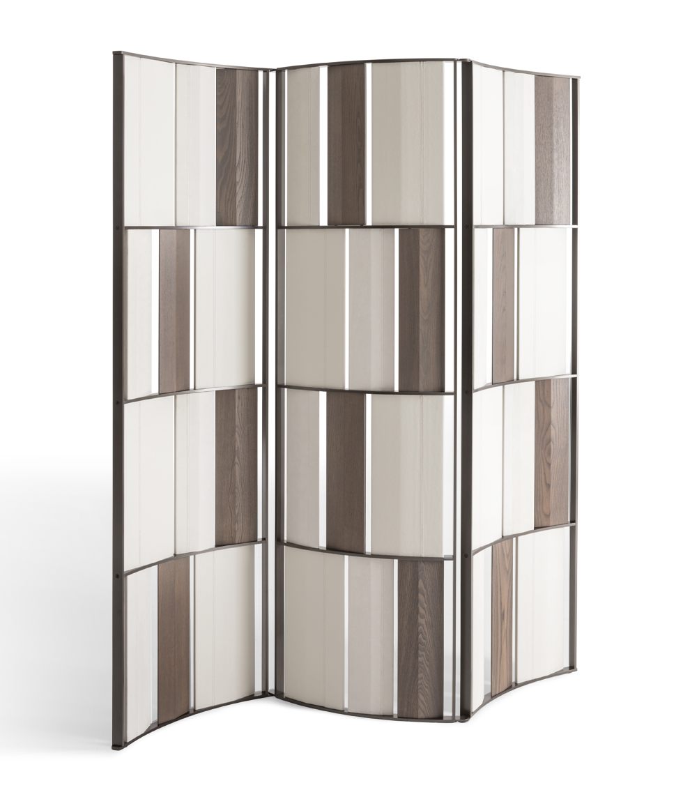The Kiranami screen features a flowing design inspired by the ripples of the sea, created through the repetition of tiles. It is composed of three undulating panels with a consistent radius and a self-locking pewter-painted aluminum structure.