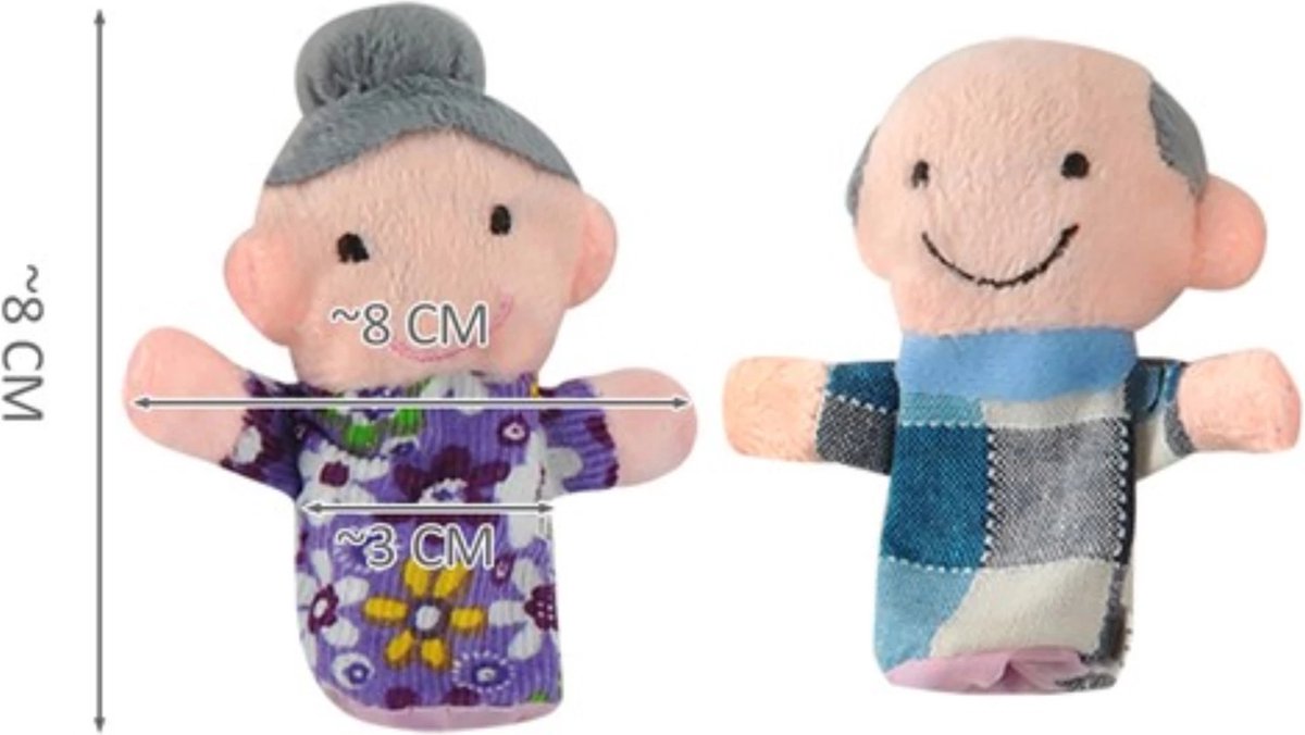 - 6 kleurrijke en pluche vingerpoppetjes in verschillende ontwerpen.