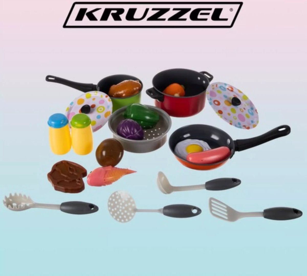 De Kruzzel Kinderkookset is de ideale speelset voor iedere jonge chef-kok die dol is op koken en creatief spel. Deze 23-delige set bevat alles wat je kind nodig heeft om de sterren van de keuken te worden, van potten en pannen tot diverse voedselproducten. Perfect voor in de speelgoedkeuken en een geweldige manier om de verbeelding te stimuleren!