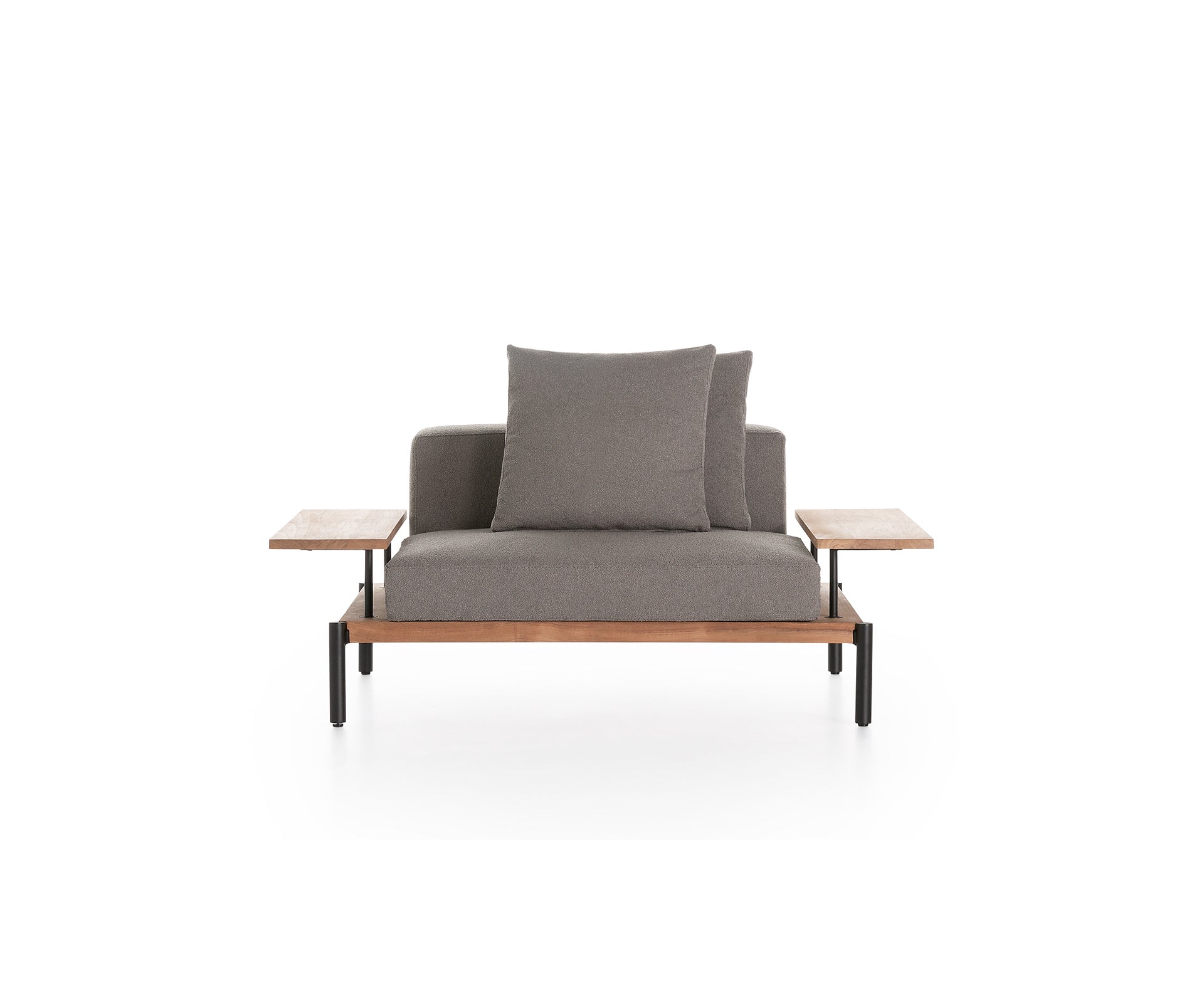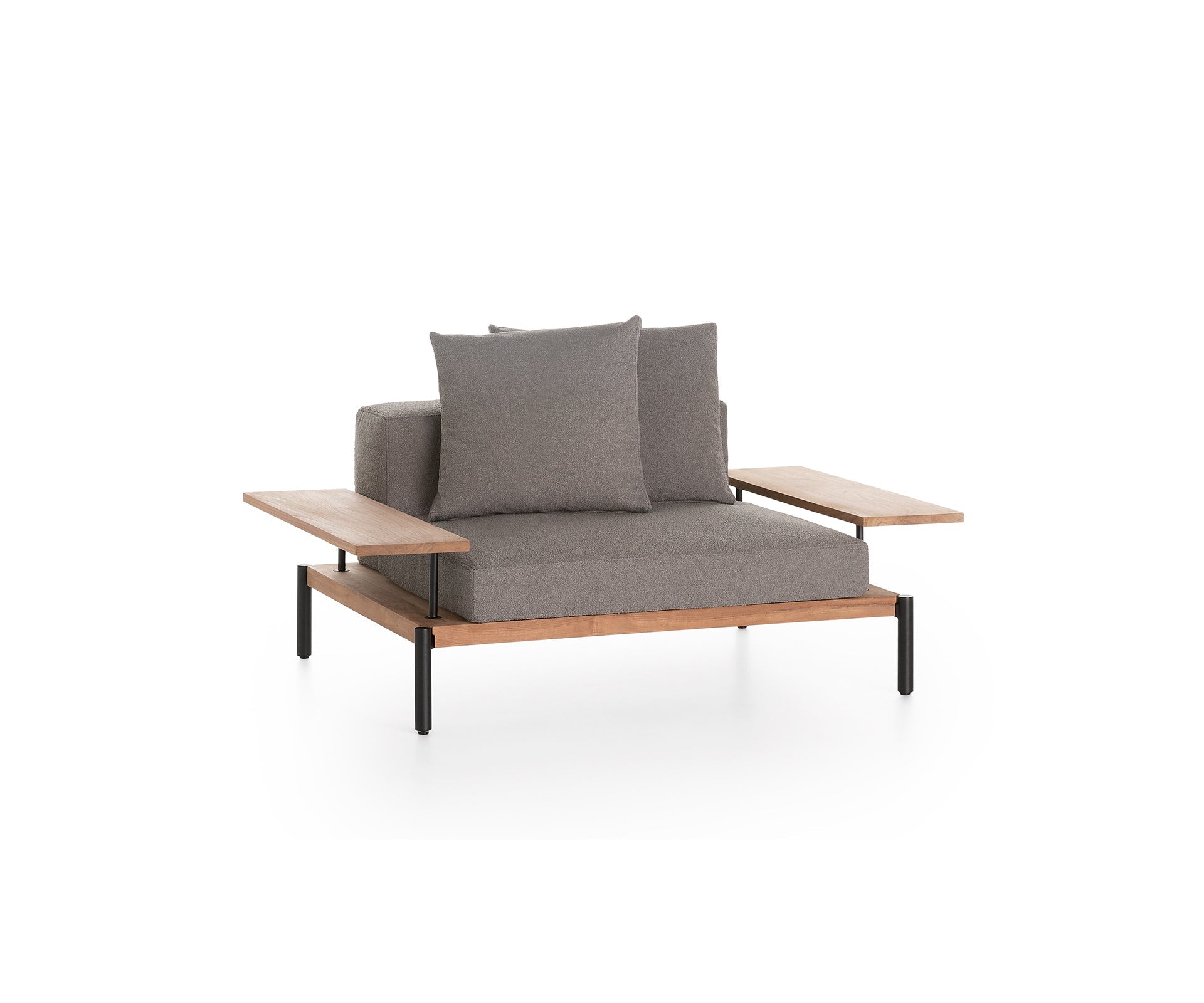 The LADEMADERA lounge chair is a designer lounge chair made of teak wood obtained from sustainable forests and black powder-coated aluminum, both 100% recyclable materials. Thanks to its timeless design and its availability in all GANDIABLASCO fabrics -Nautica, Soft, Warm, Warm Recycled, and Warm Premium- this outdoor lounge chair easily integrates into any environment.