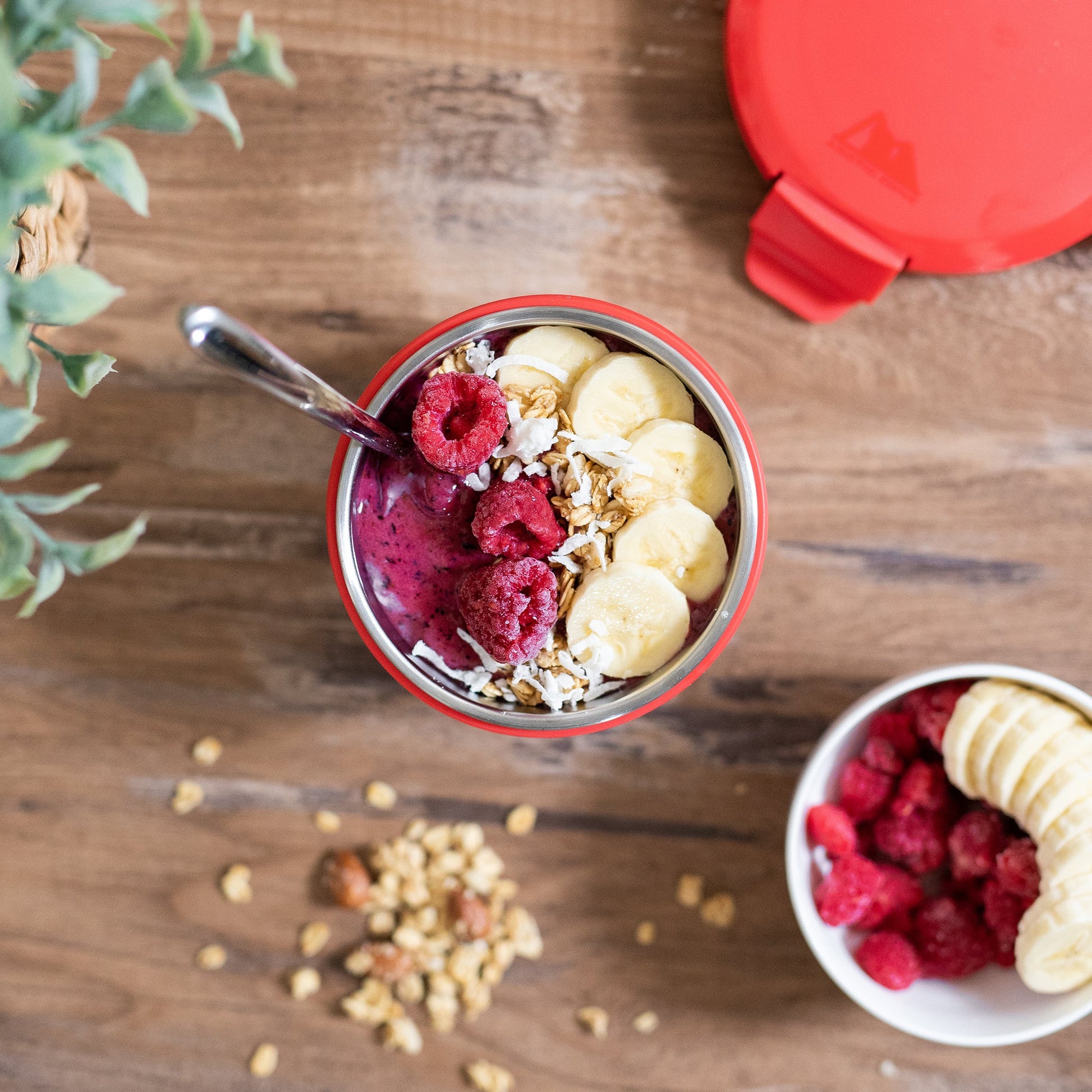 The container is constructed of stainless steel with triple-walled vacuum insulation for temperature retention and copper lining for better performance. It features an extra large opening and holds 2 cups (16 oz./480mL). The perfect size for personal food transport!