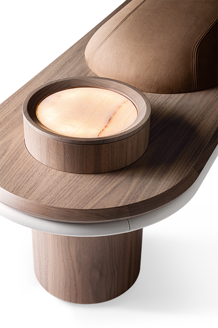 The second cylinder, in Canaletto walnut, includes an onyx top that can be backlit for a unique ambiance.