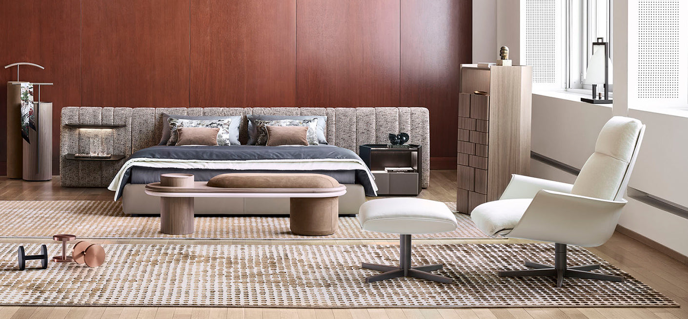 The LIZ-BENCH is a luxurious bench crafted for cozy, intimate spaces and characterized by its soft, cylindrical shapes, combining rich materials and thoughtful lighting to enhance intimate spaces with a cozy yet refined aesthetic.