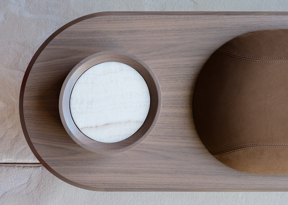 Customizable bench in Canaletto walnut with onyx insert, covered in fabric or leather (with LED).