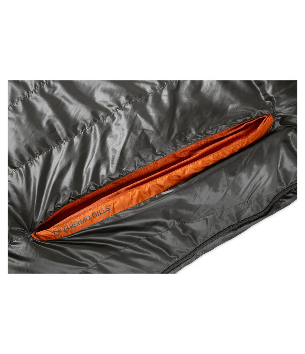 Disco includes a set of next-generation Thermo Gill™ vents on the chest to offer fine-tuned temperature control and a better outdoor sleeping experience. Each Gill features an interior and an exterior zipper with a draft-blocking intermediate layer, allowing several different configurations for dialing in the bag’s temperature without direct exposure to cold air. Our Blanket Fold™ draft collar at the neckline features a redesigned size and shape to further optimize sleep temperature. Tucked in, the Blanket Fold defiantly blocks any chill while mimicking the comfort of your bed at home. Pushed out, it helps dump excess heat instantly. Finally, Disco’s revamped design has baffles insulated with water-resistant, RDS-certified down, placed vertically along the torso for comfort and aligned horizontally below the waist to prevent down migration.