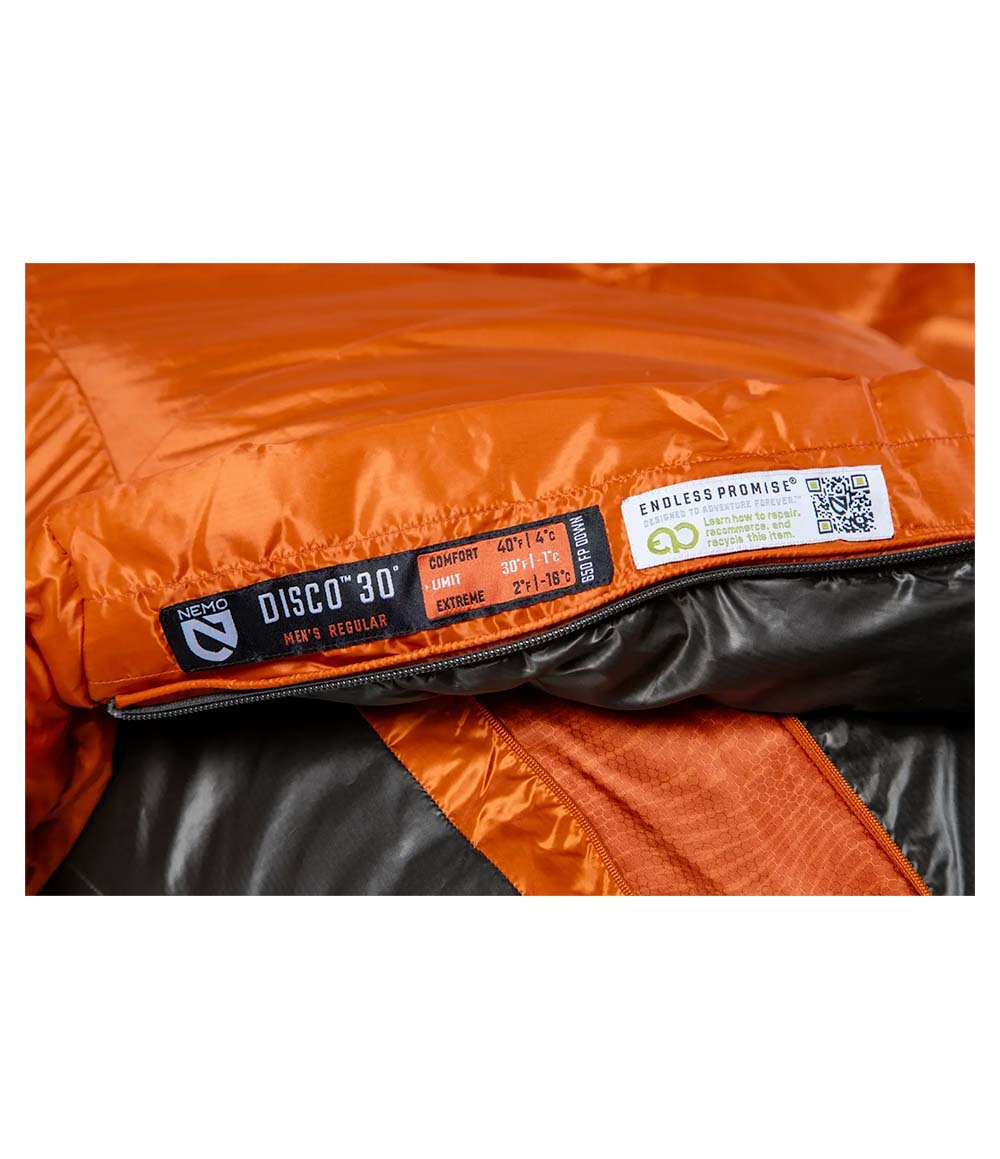 Along with this suite of top features, Disco now boasts the purpose-driven Endless Promise® designation, meaning it was designed specifically to stay out of the landfill and on the trail, forever. With a shell manufactured fully from PET, this sleeping bag is 100% recyclable at the end of its life — just send it back to NEMO, and we’ll handle the rest.