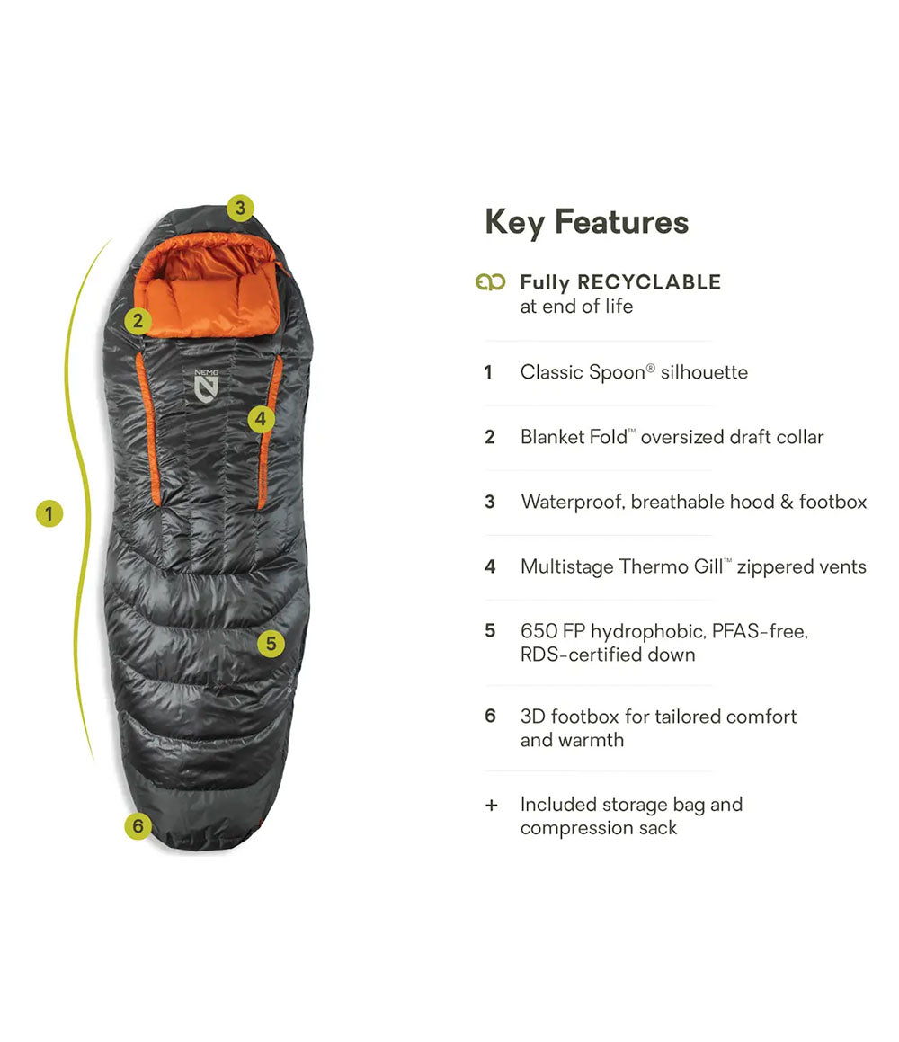 The reigning favorite down bag for backpackers, Disco™ features the best-of-all-worlds Classic Spoon® silhouette for ultimate side-sleeping comfort. NEMO’s iconic Spoon bags are cut generously at the elbows and knees so campers can shift positions comfortably throughout the night, but shave unnecessary weight so gear still packs up light. The Classic Spoon is the sweet spot of the line, balancing packability with plush, roomy comfort.
