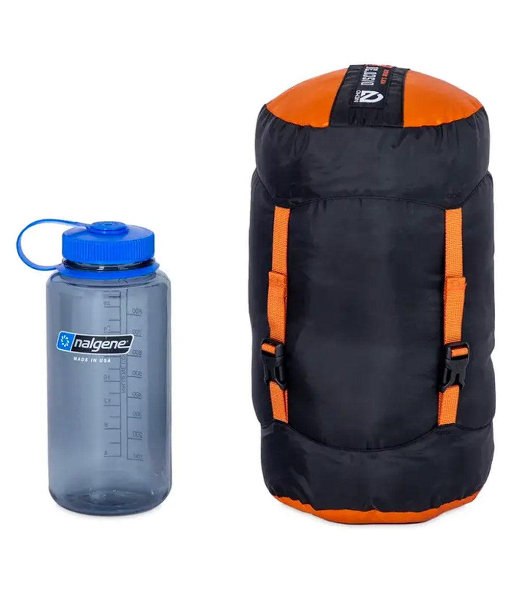 - Hood and footbox are reinforced with recyclable material treated with PFAS-free waterproofing to prevent tent condensation from soaking into the bag’s fabric.