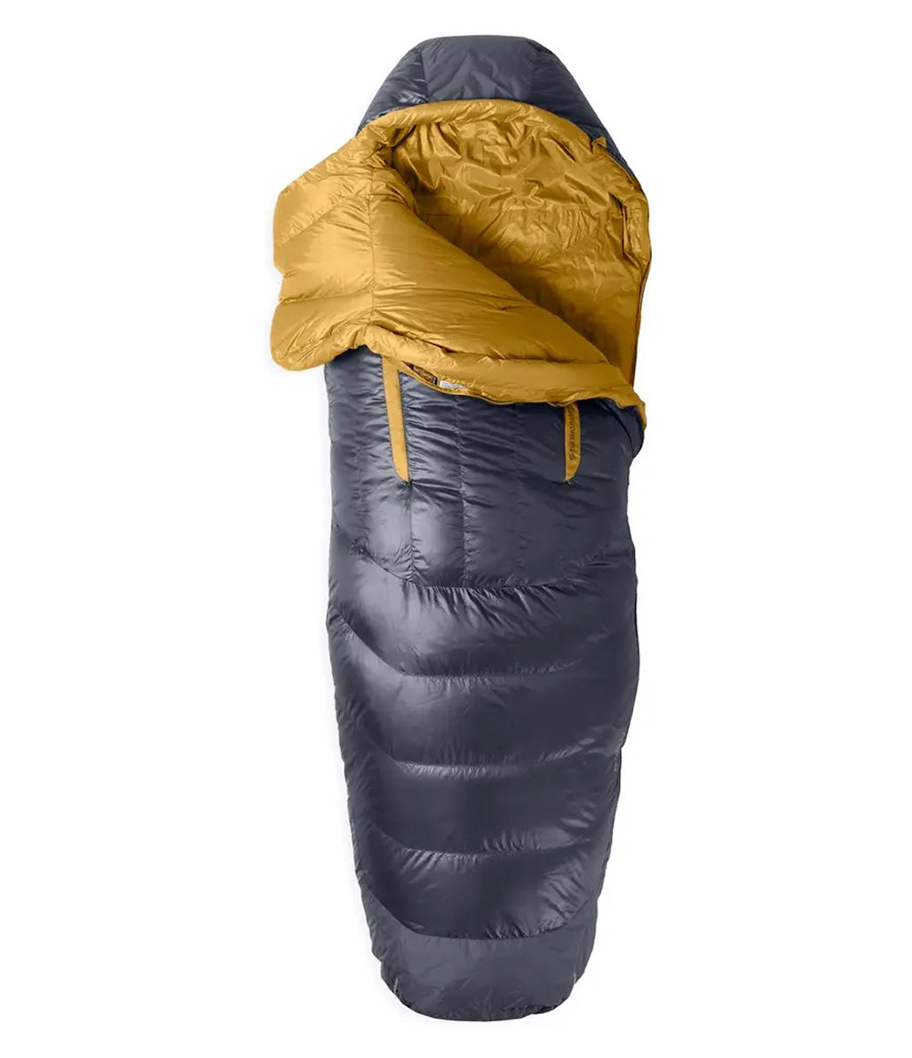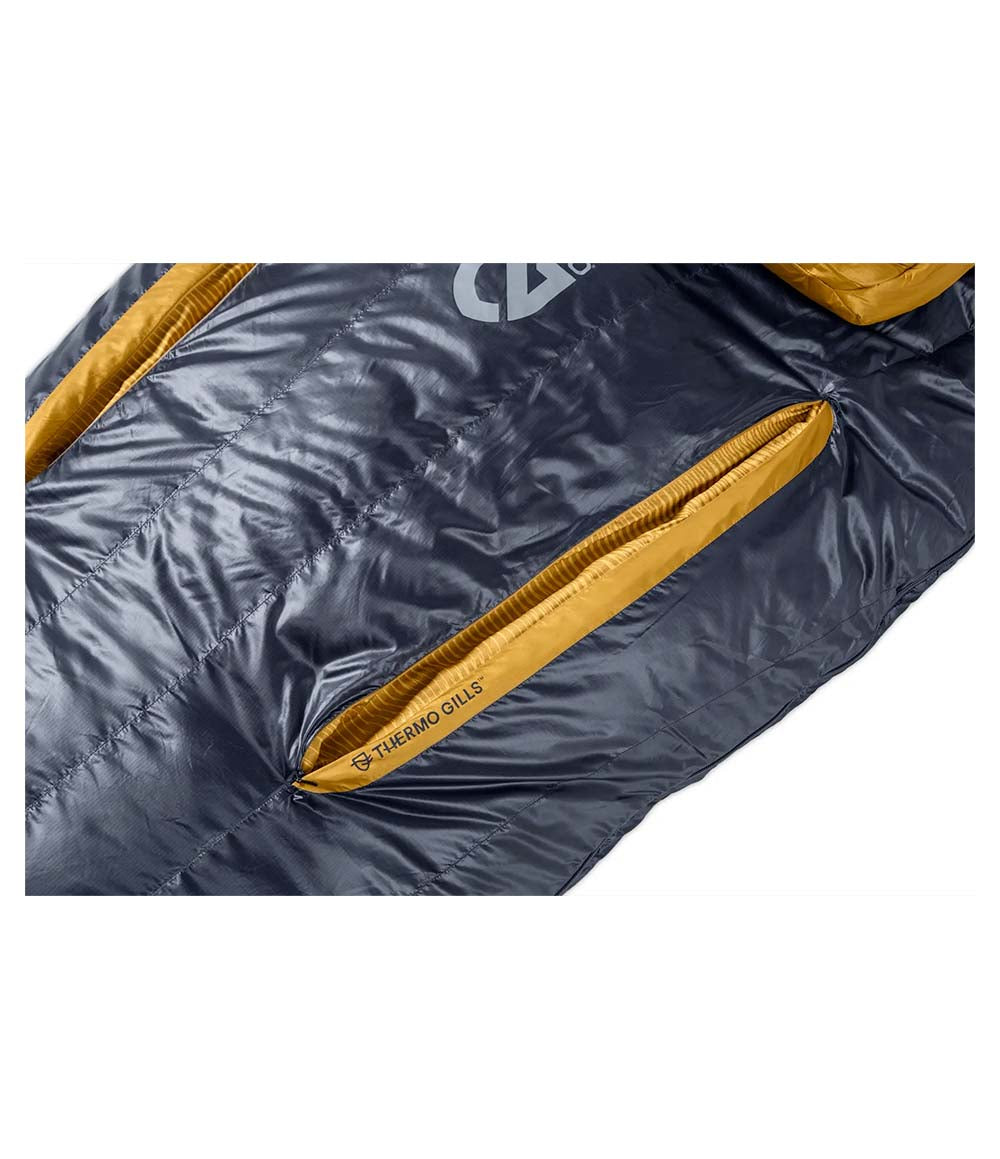 Disco includes a set of next-generation Thermo Gill™ vents on the chest to offer fine-tuned temperature control and a better outdoor sleeping experience. Each Gill features an interior and an exterior zipper with a draft-blocking intermediate layer, allowing several different configurations for dialing in the bag’s temperature without direct exposure to cold air. Our Blanket Fold™ draft collar at the neckline features a redesigned size and shape to further optimize sleep temperature. Tucked in, the Blanket Fold defiantly blocks any chill while mimicking the comfort of your bed at home. Pushed out, it helps dump excess heat instantly. Finally, Disco’s revamped design has baffles insulated with water-resistant, RDS-certified down, placed vertically along the torso for comfort and aligned horizontally below the waist to prevent down migration.