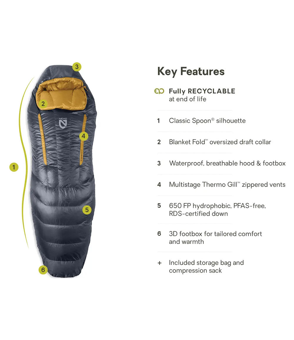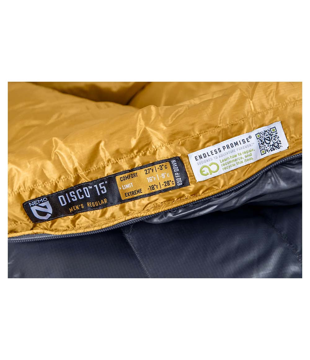 Along with this suite of top features, Disco now boasts the purpose-driven Endless Promise® designation, meaning it was designed specifically to stay out of the landfill and on the trail, forever. With a shell manufactured fully from PET, this sleeping bag is 100% recyclable at the end of its life — just send it back to NEMO, and we’ll handle the rest.