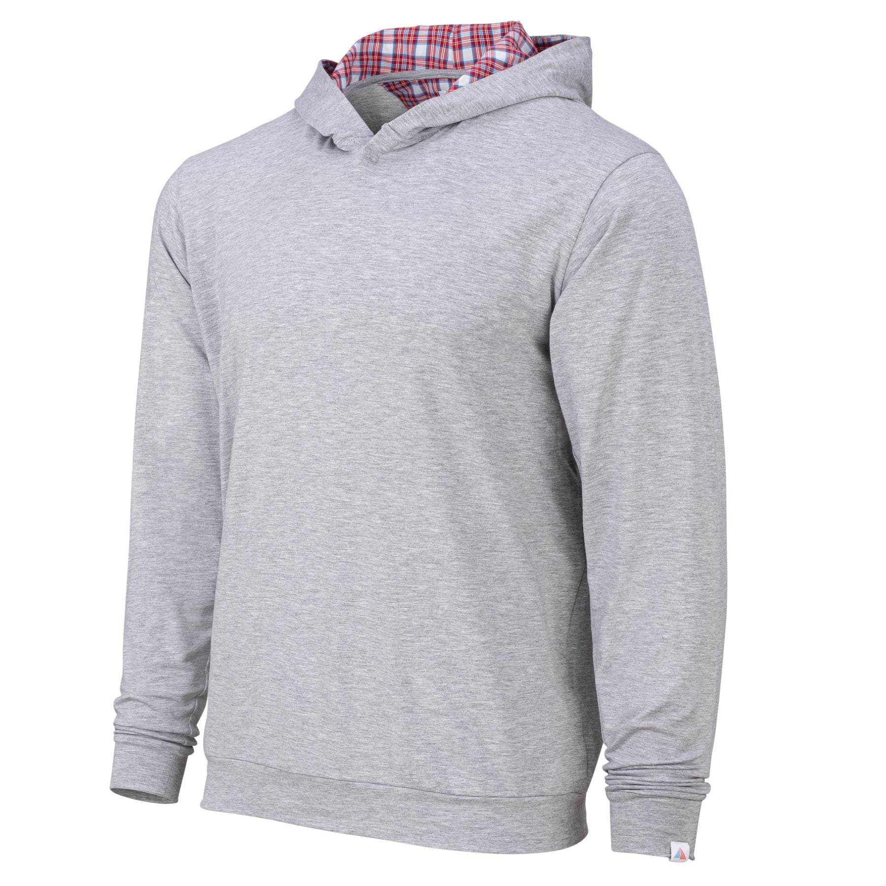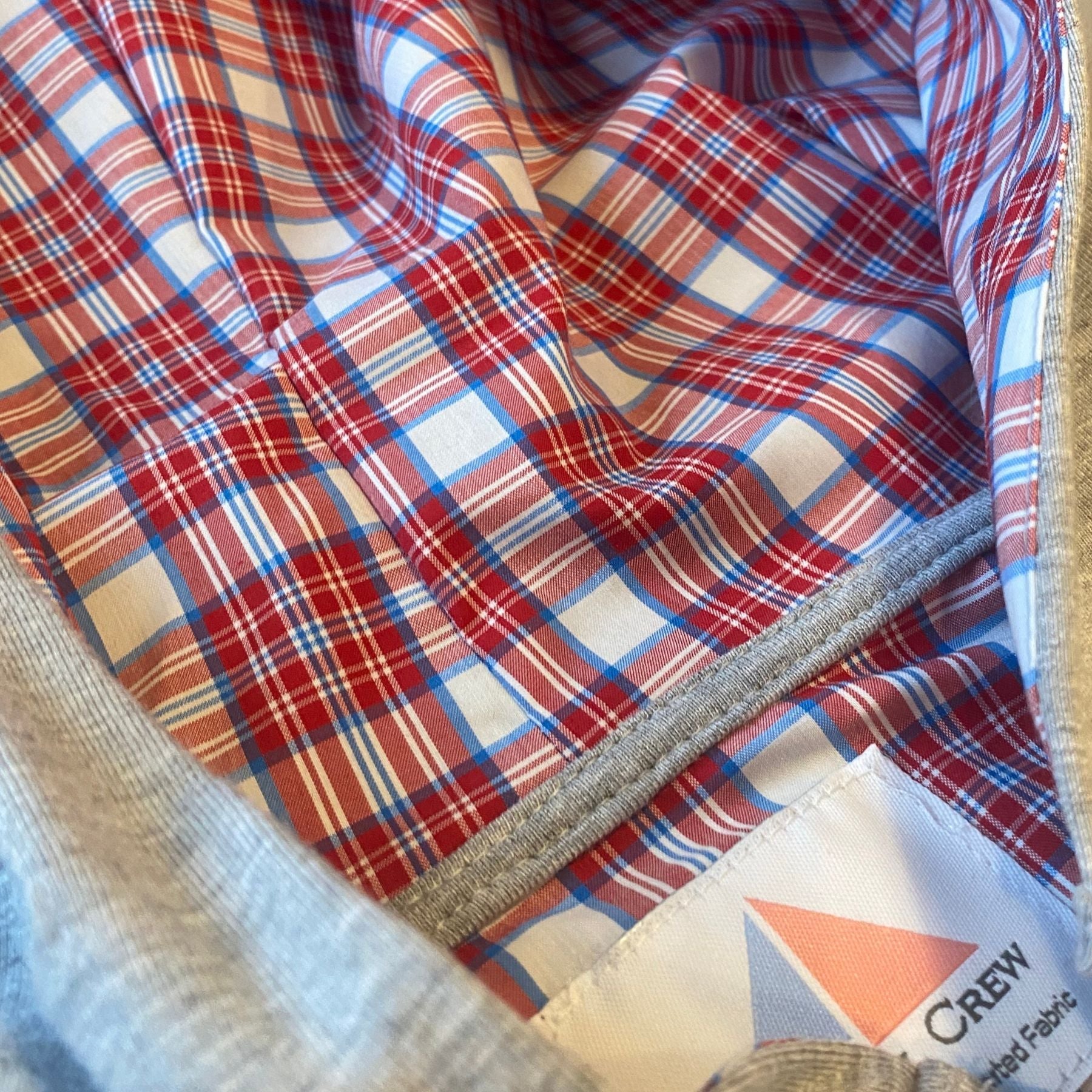 Athletic Grey with White, Red and Royal Blue Plaid fabric lining the hood.