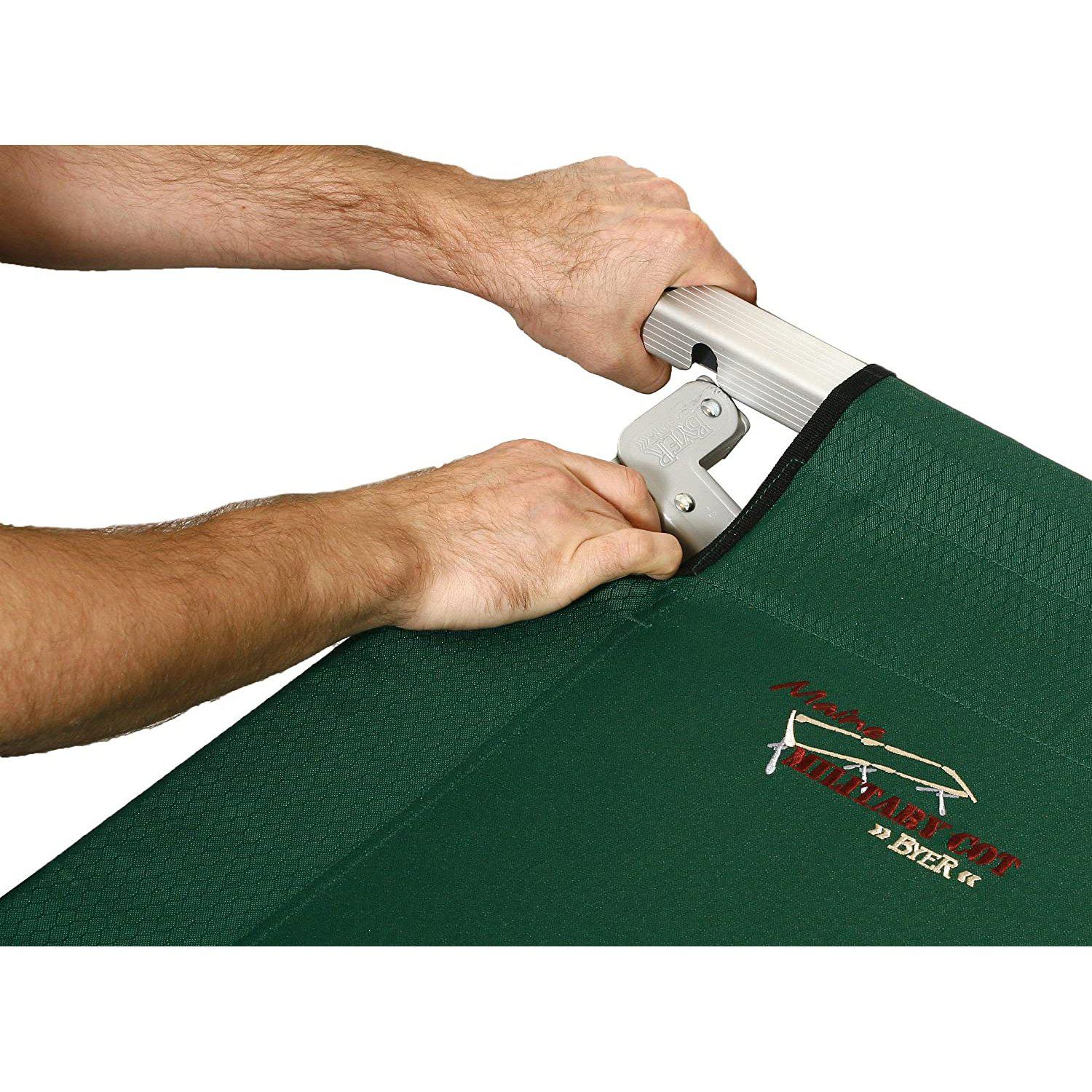 Strong, Versatile Full-Sized Cot is now even stronger. The Maine Military Cot HD is our largest and strongest model. This design represents the culmination of over 140 years of experience in refining the design of military style cots. The Maine Military HD is crafted with full 1-1/4” square aircraft aluminum tubing. Beginning in year 2020, all legs and rails are now reinforced with internal steel tubing to make this legendary cot even stronger! The durable rip-stop polyester fabric is treated for water repellency and is reinforced along the center of the sleeping surface. The cot also features a generous gear pouch with multiple pockets. This heavy-duty cot has been strength tested to a capacity of 1,100 pounds and has a conservative weight capacity of 375 pounds. The Maine Military HD is the ideal solution for emergency preparedness, when large size and high strength are necessary. The cot comes with straps and a carry bag for easy transport.