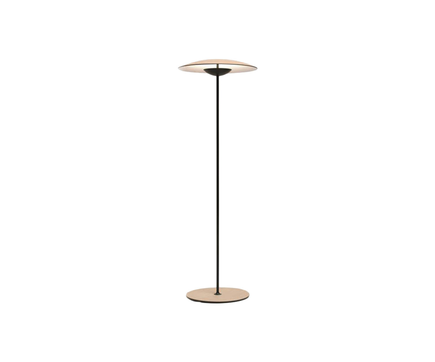 The Floor Sample Ginger Floor Lamp is inspired by the 1960s rock band Ginger Baker of Cream. The Ginger Floor Lamp features a pressed wood base and diffuser with an injected aluminum dissipater in black matte and lacquered matte black metal stem.