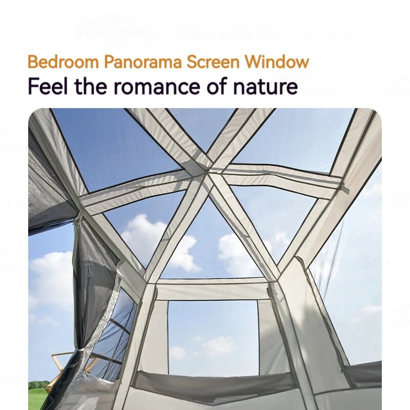 Mobi Garden HOLIDAY Series 8.9 Fast Automatic Cabin Style Tent for 5-6 Person Waterproof Black Vinyl Coated Sunscreen Awning Canopy Large up to 19m² Total Usable Space Quick Open Outdoor Camping Tent Mobigarden village Mountain Residence